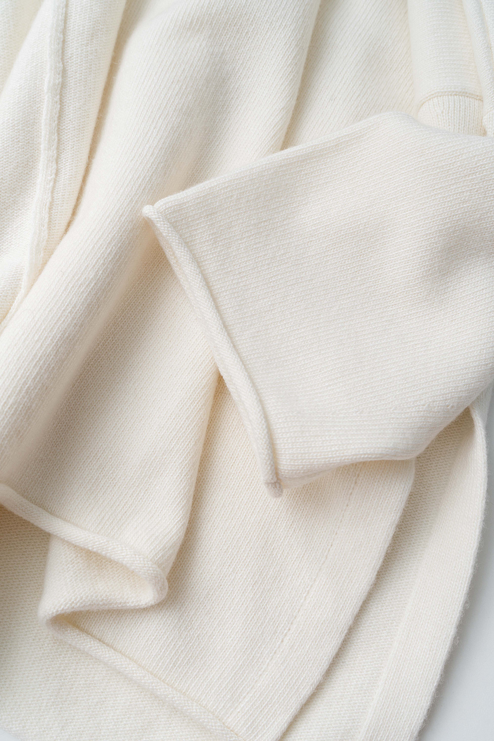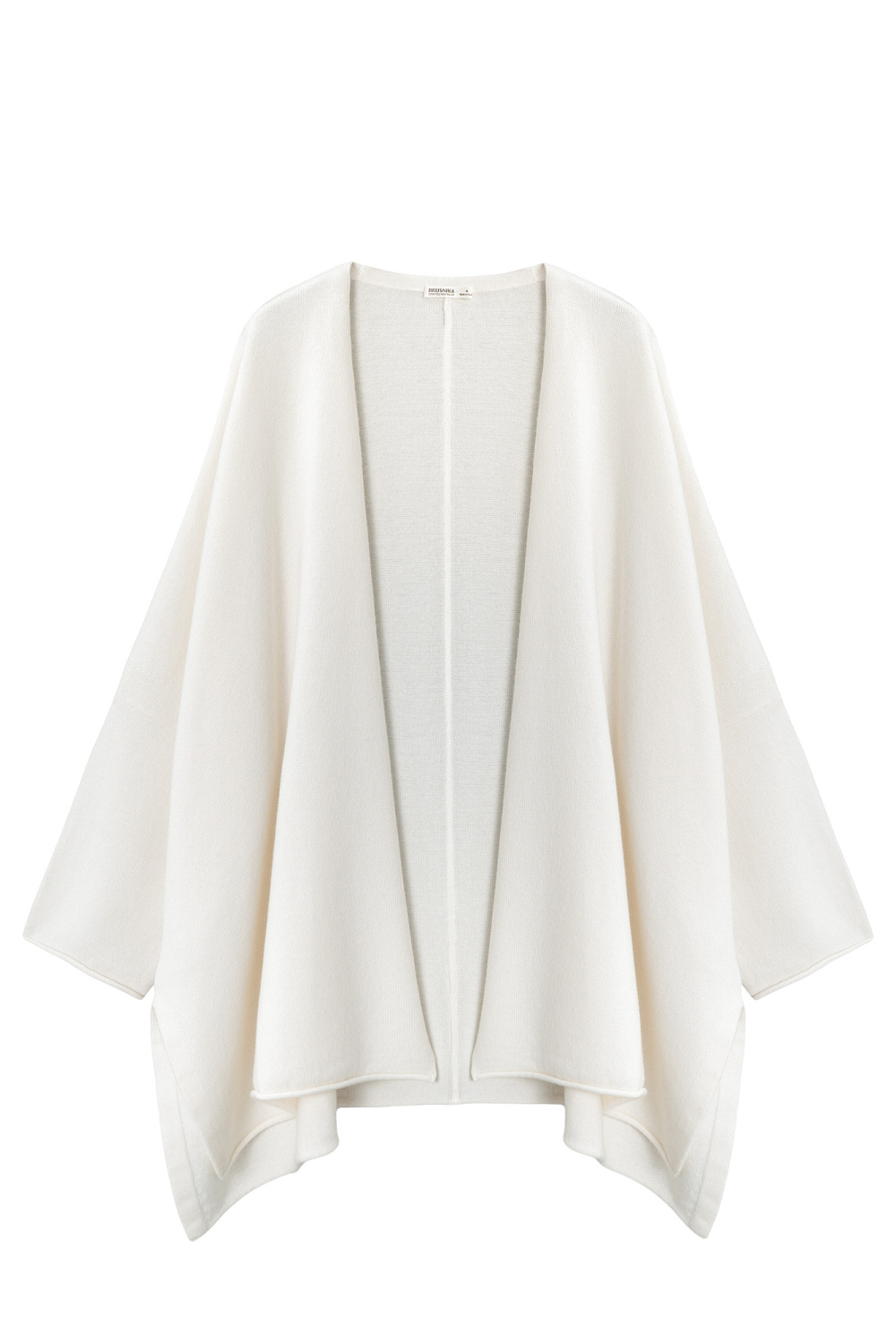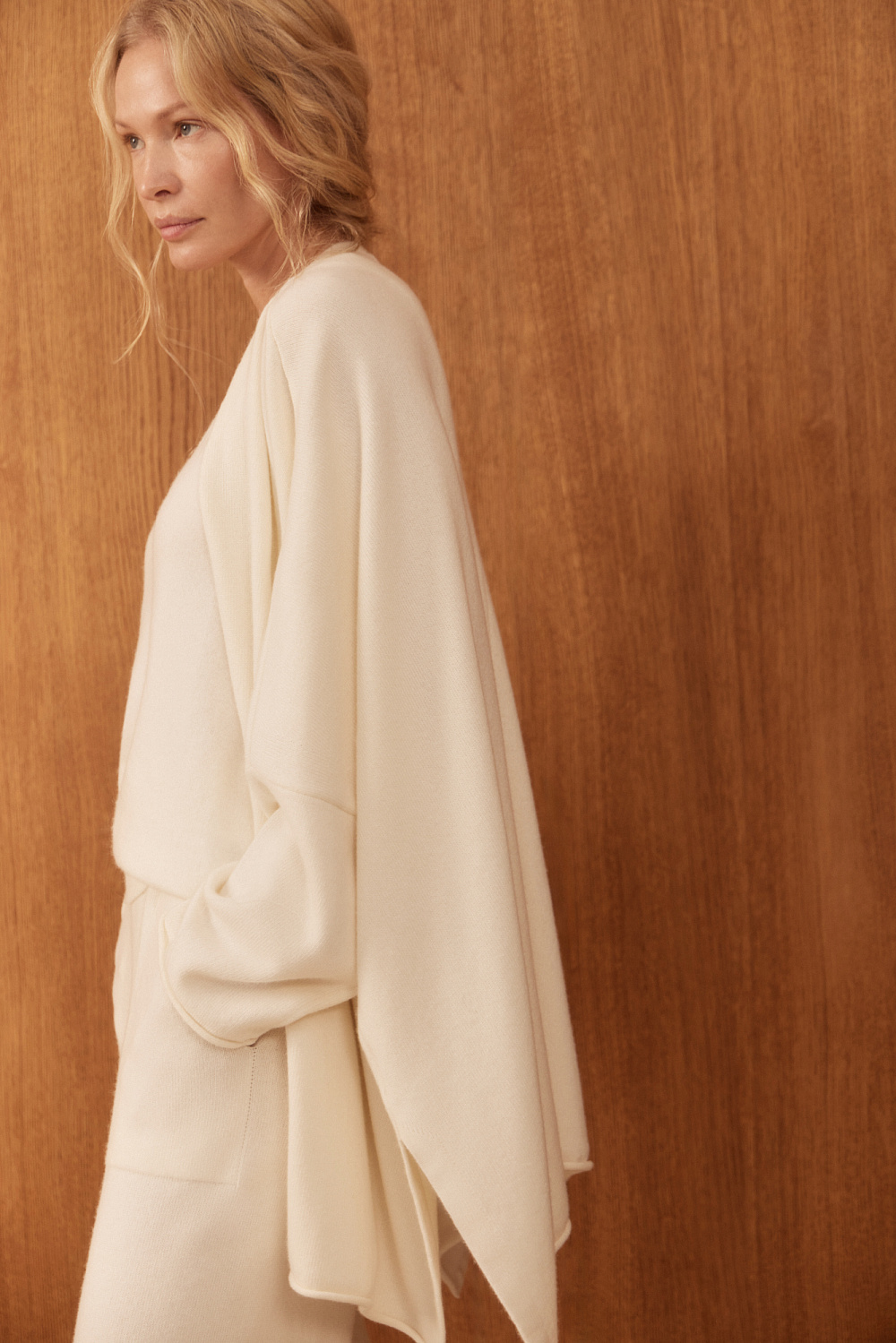 Knitted cardigan made of wool and cashmere. The model has a loose fit, with long wide sleeves and dropped shoulders. No clasp.