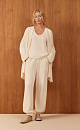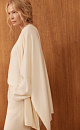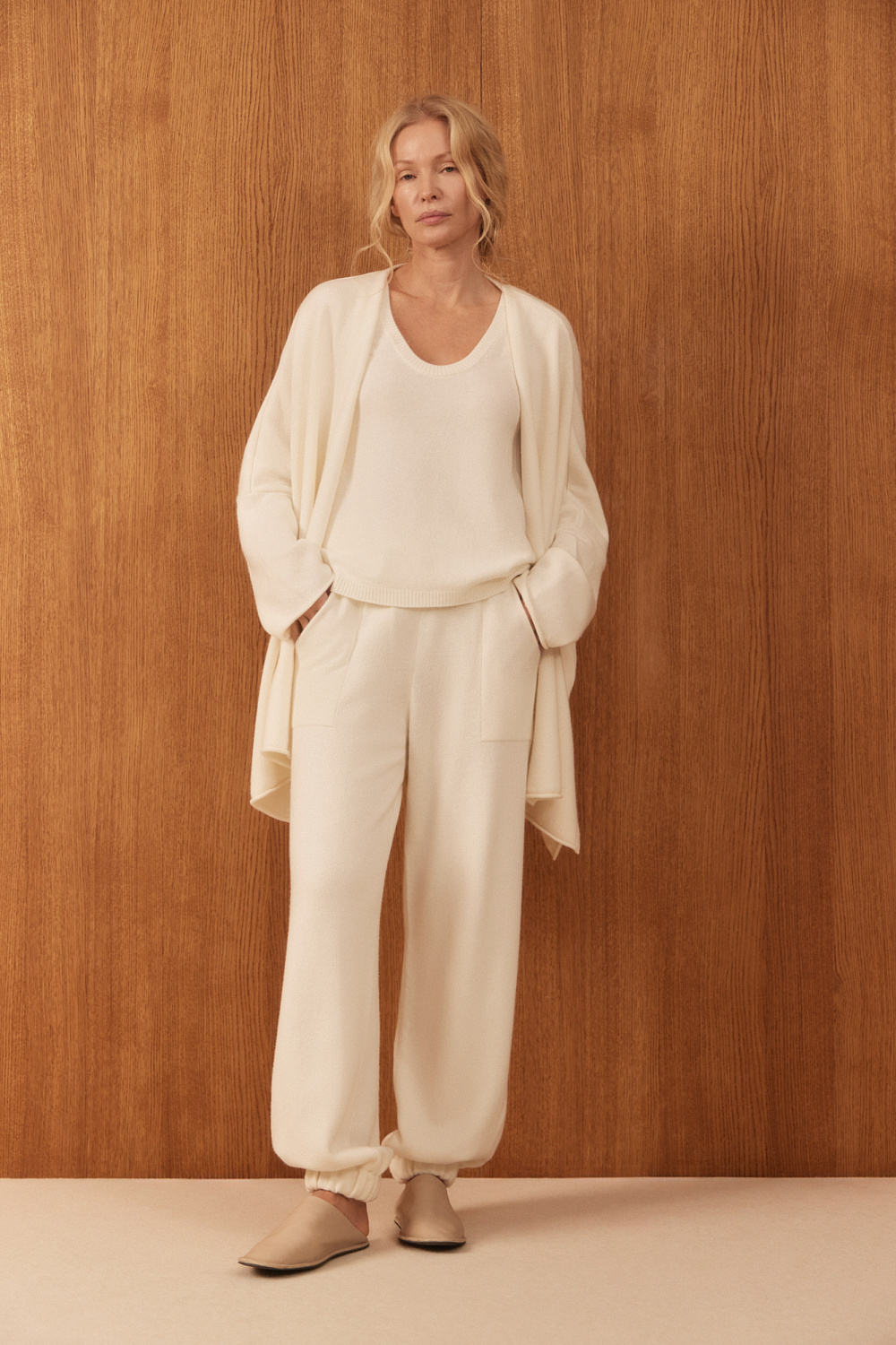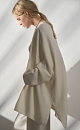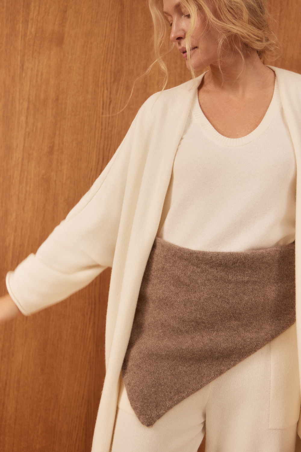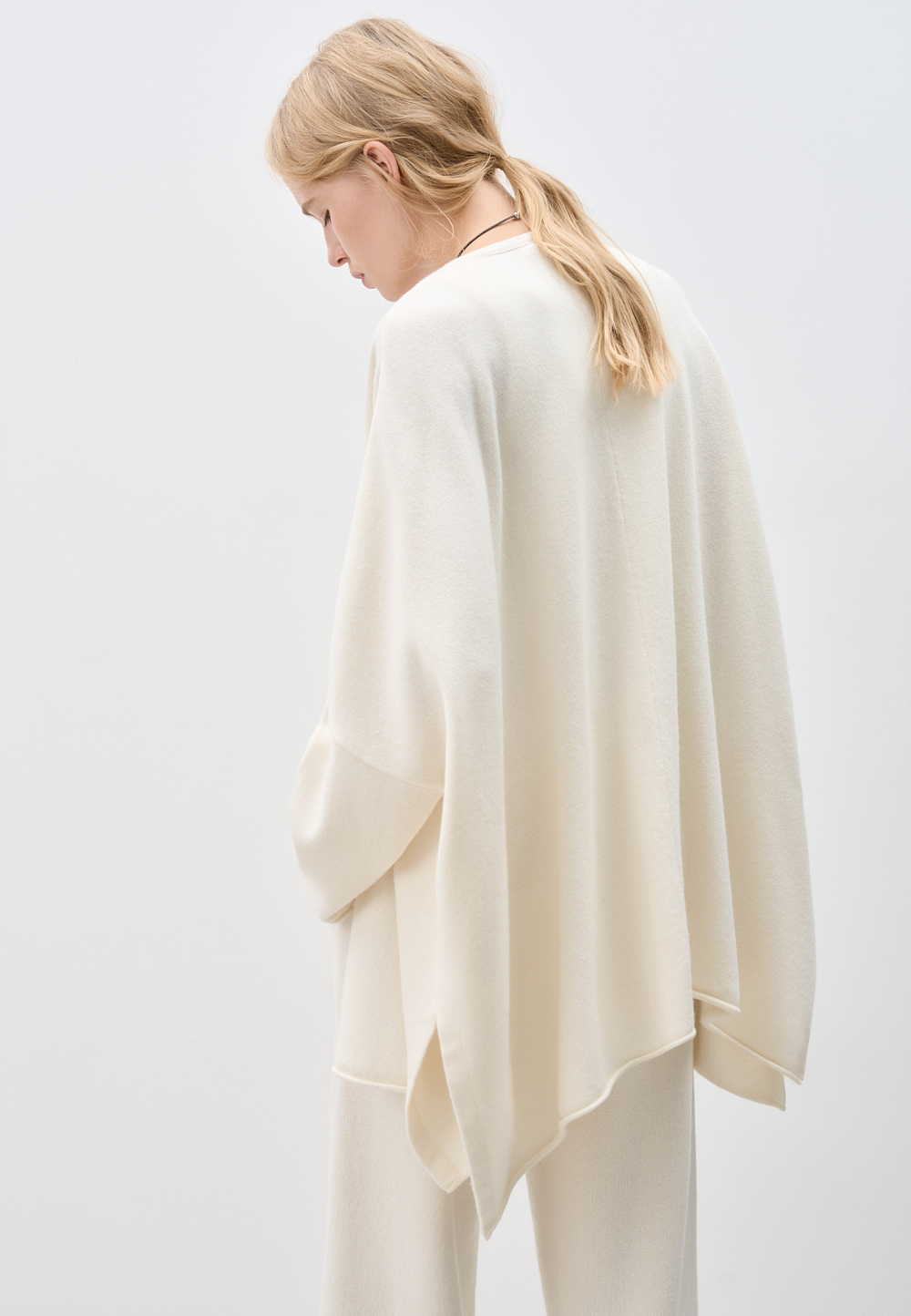 Knitted cardigan made of wool and cashmere. The model has a loose fit, with long wide sleeves and dropped shoulders. No clasp.