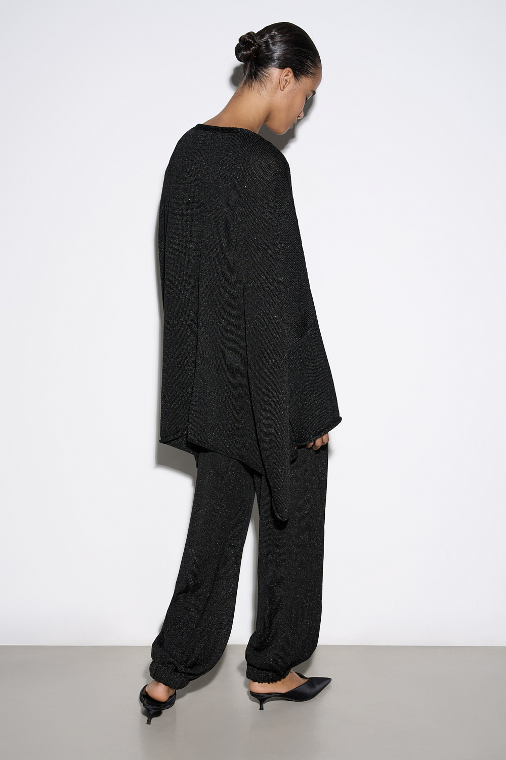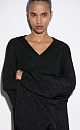 Knitted cardigan with lurex. The model has a loose fit, with long wide sleeves and dropped shoulders. No clasp.