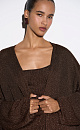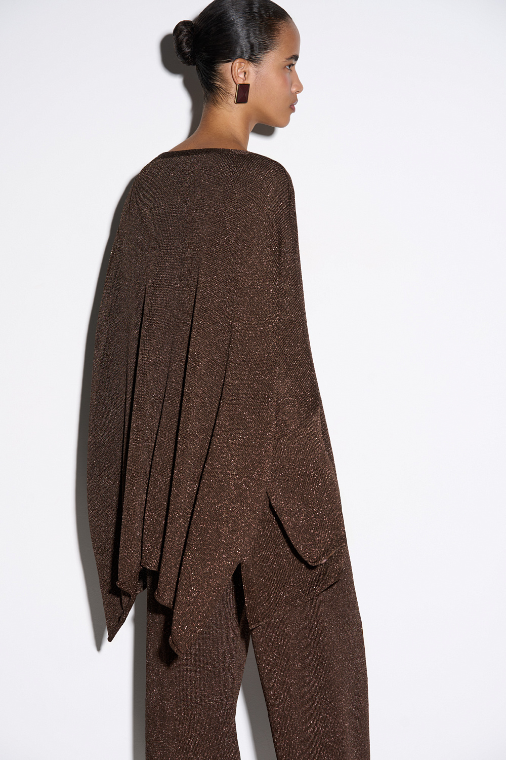 Knitted cardigan with lurex. The model has a loose fit, with long wide sleeves and dropped shoulders. No clasp.