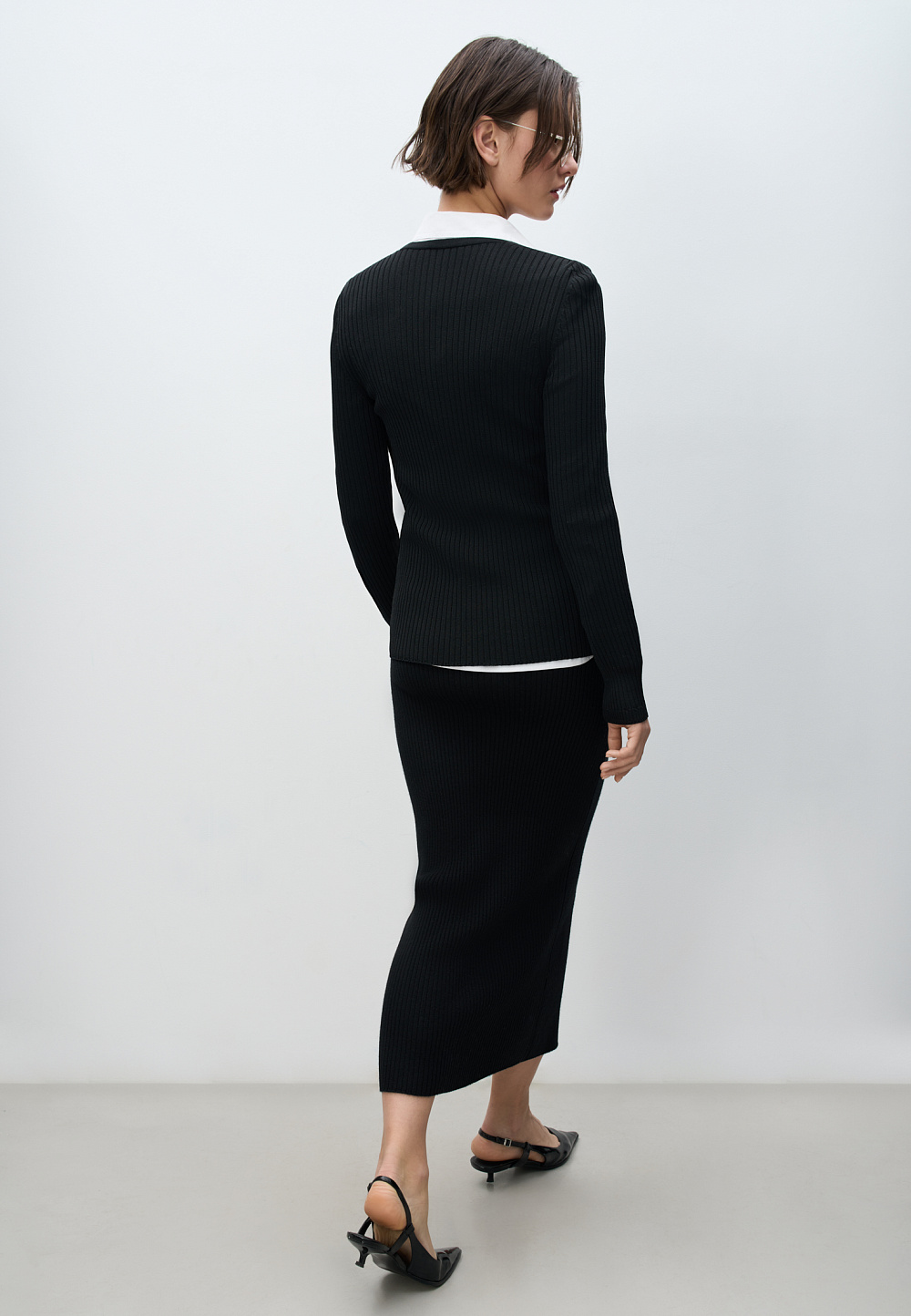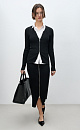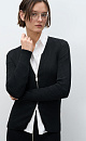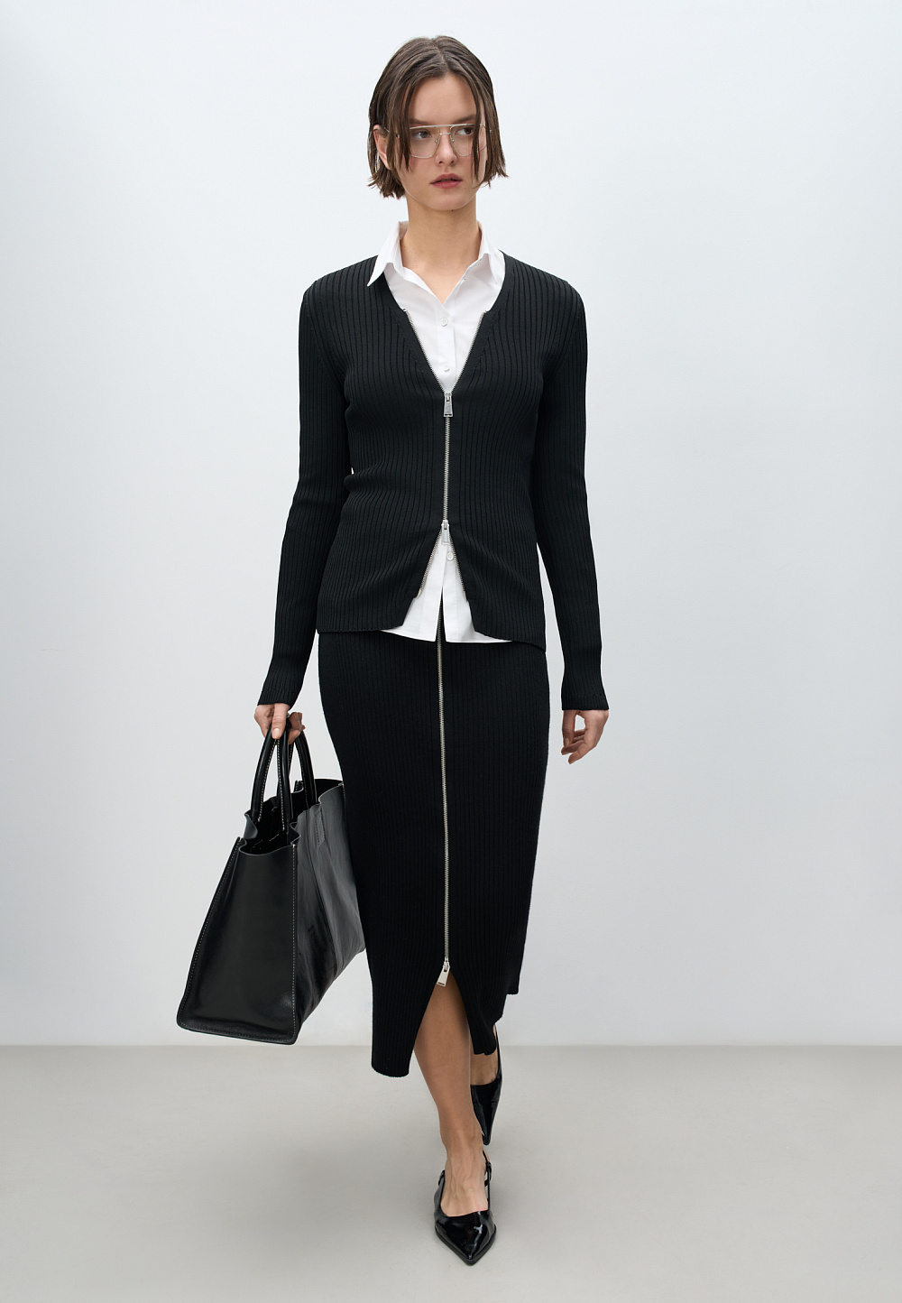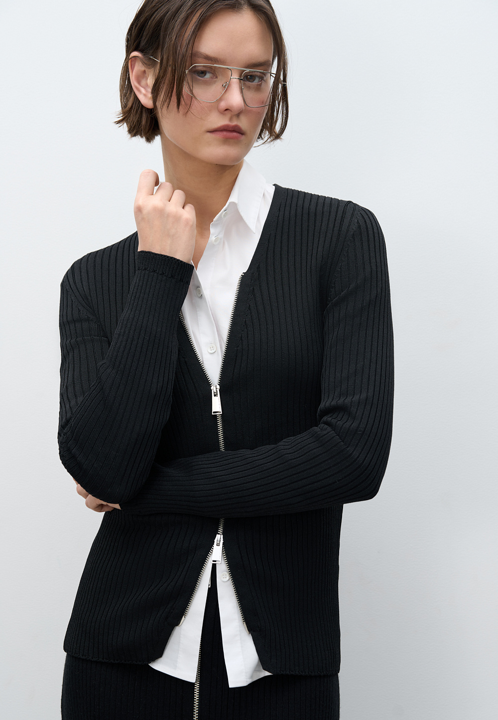 Knitted cardigan with zipper made of viscose. The model has a straight silhouette, long sleeves and a V-neck. The product is made with a wide rib.