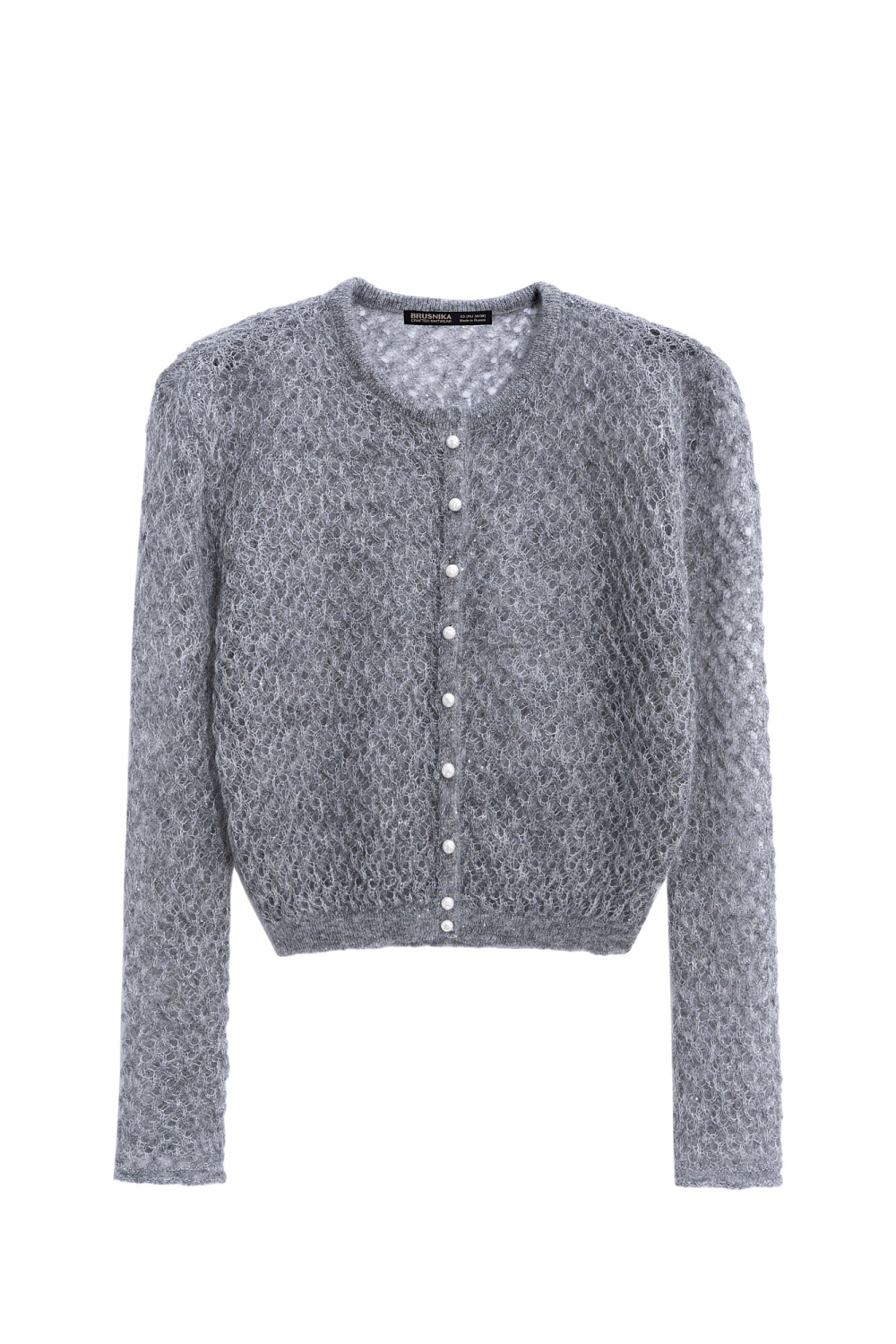 Knitted openwork cardigan made of kidmohair, decorated with small sequins. Loose silhouette with long sleeves, round neckline and pearl button closure.