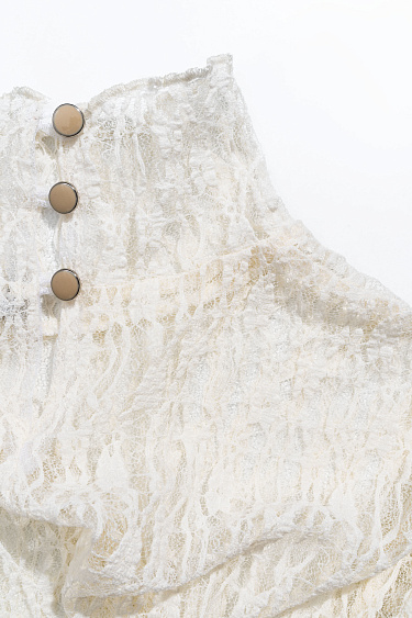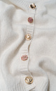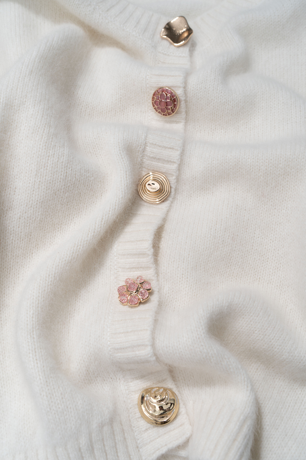 Knitted cardigan made of fox down. Loose silhouette model with dropped shoulders and a round neckline. The product is decorated with large accent buttons.
