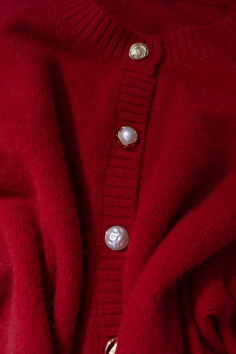 Knitted cardigan made of fox down. Loose silhouette model with dropped shoulders and a round neckline. The product is decorated with large accent buttons.