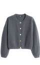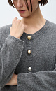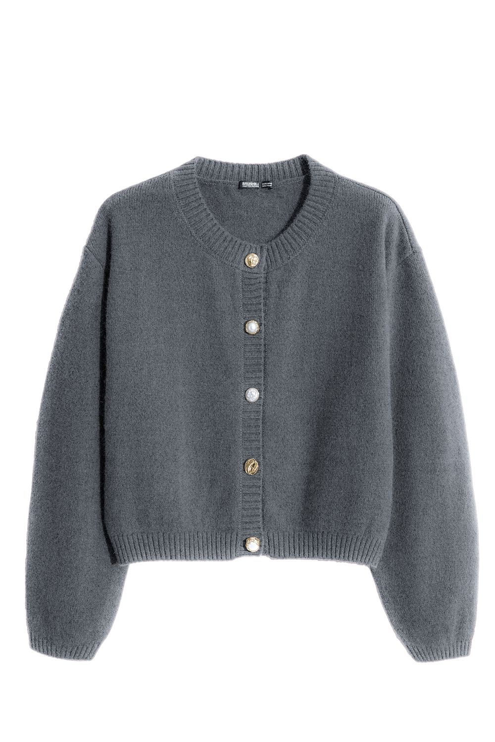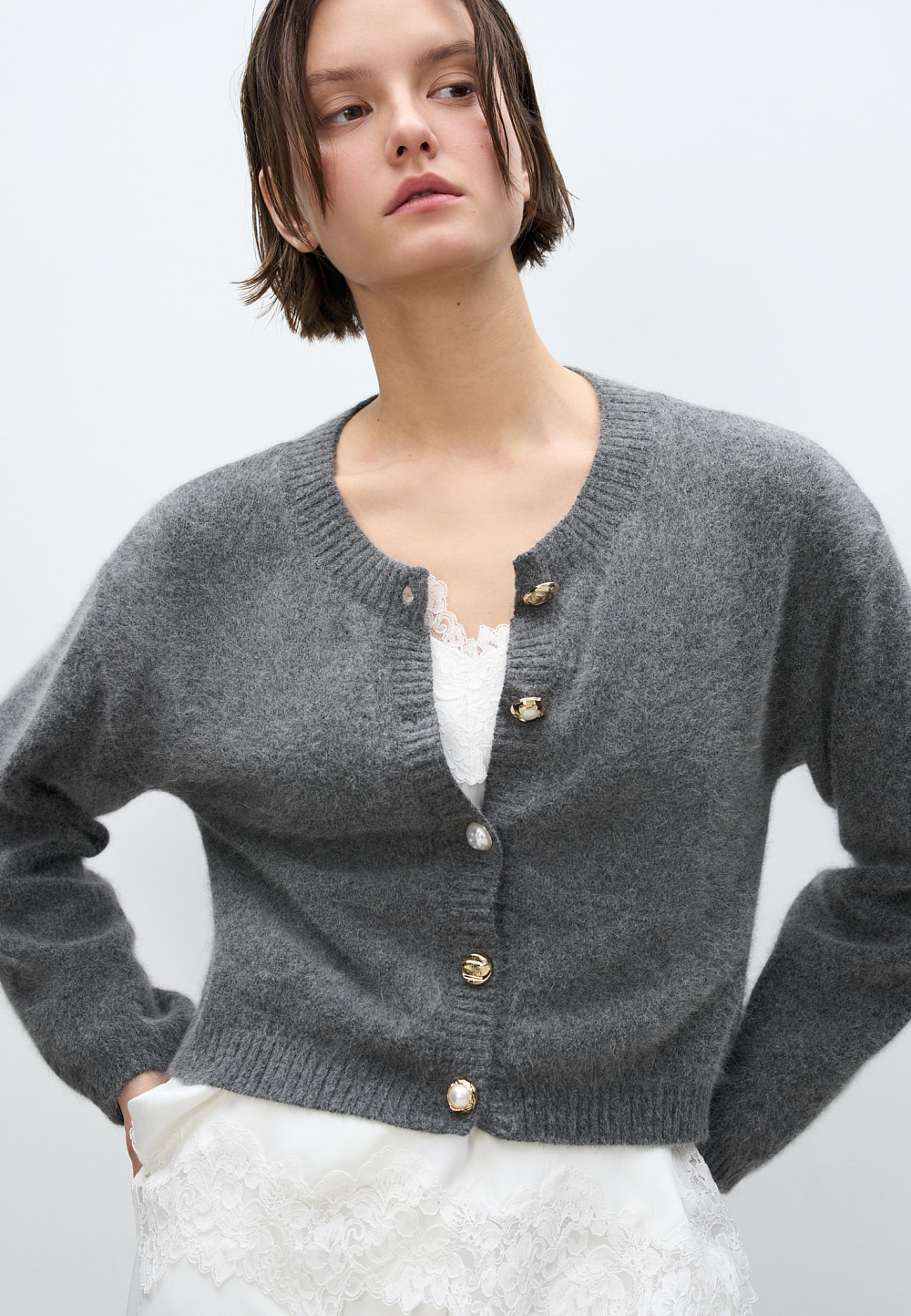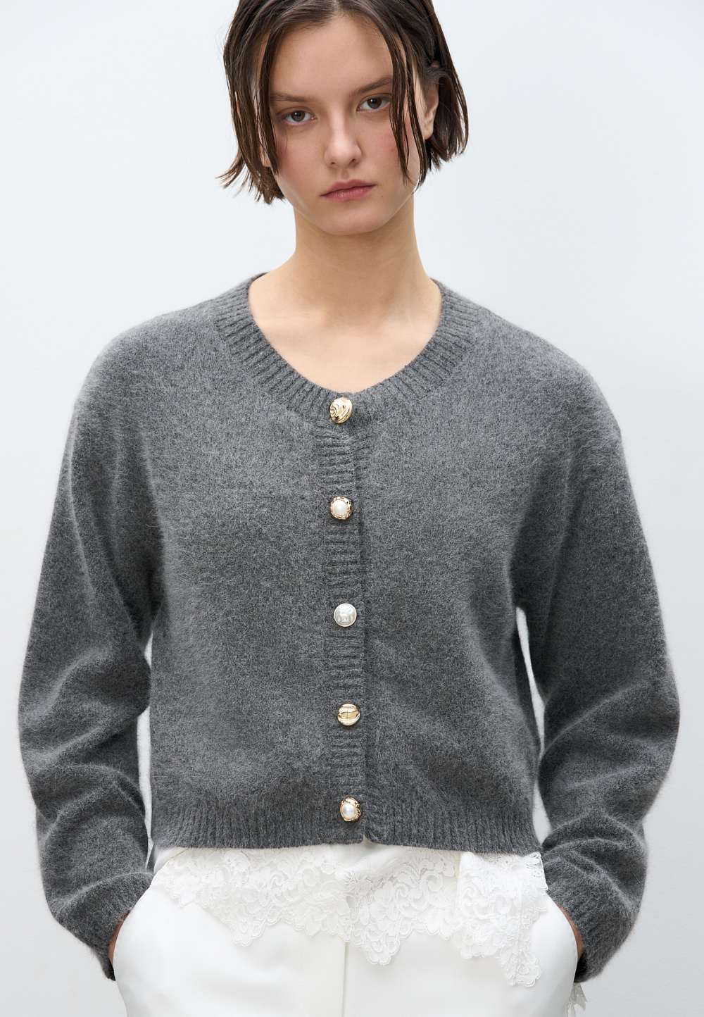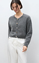 Knitted cardigan made of fox down. Loose silhouette model with dropped shoulders and a round neckline. The product is decorated with large accent buttons.