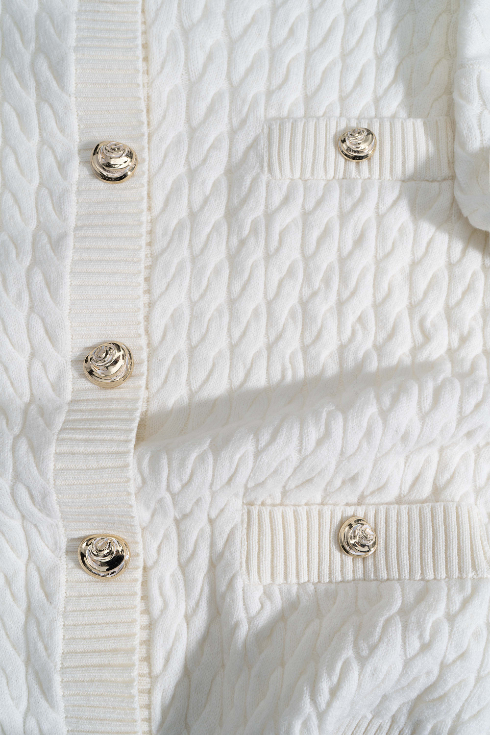 Cardigan made of 100% extrafine merino wool, made in knitted braids. Loose fit model with long sleeves, dropped shoulders and a round neckline. Imitation pockets with flaps. The product is decorated with large accent buttons.