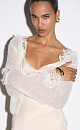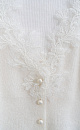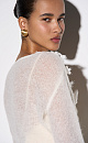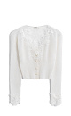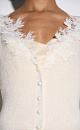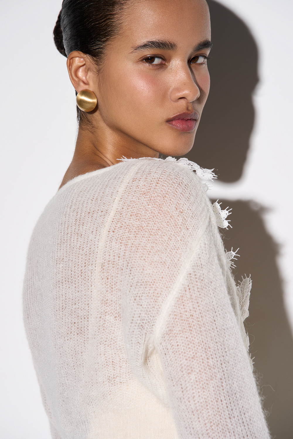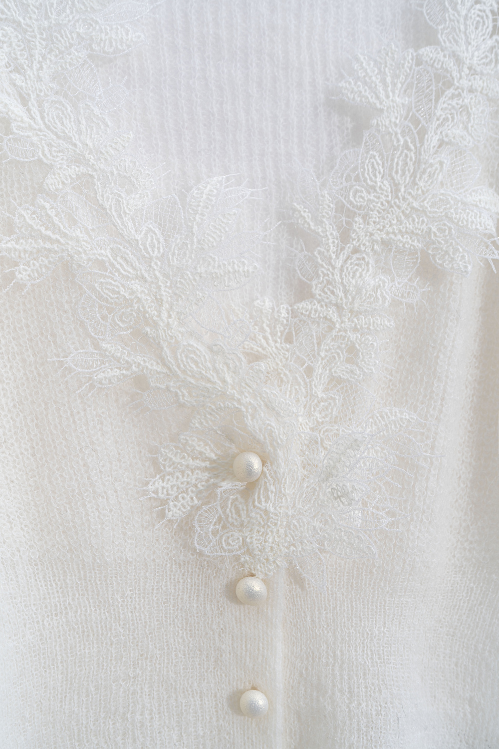 Short knitted cardigan made of fine extrafine merino wool and extrafine alpaca. Fitted model with deep V-neck. Fastening with small pearl buttons. The product is decorated with thin lace.
