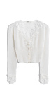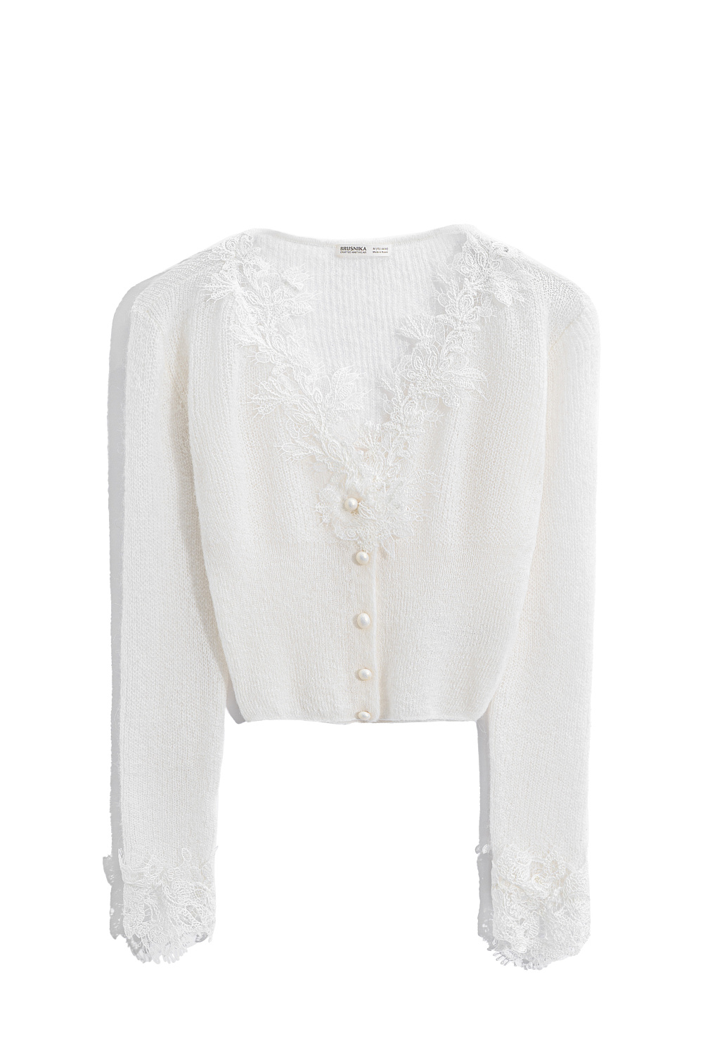 Short knitted cardigan made of fine extrafine merino wool and extrafine alpaca. Fitted model with deep V-neck. The product is decorated with thin lace. Fastening with small pearl buttons.