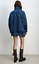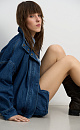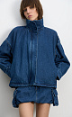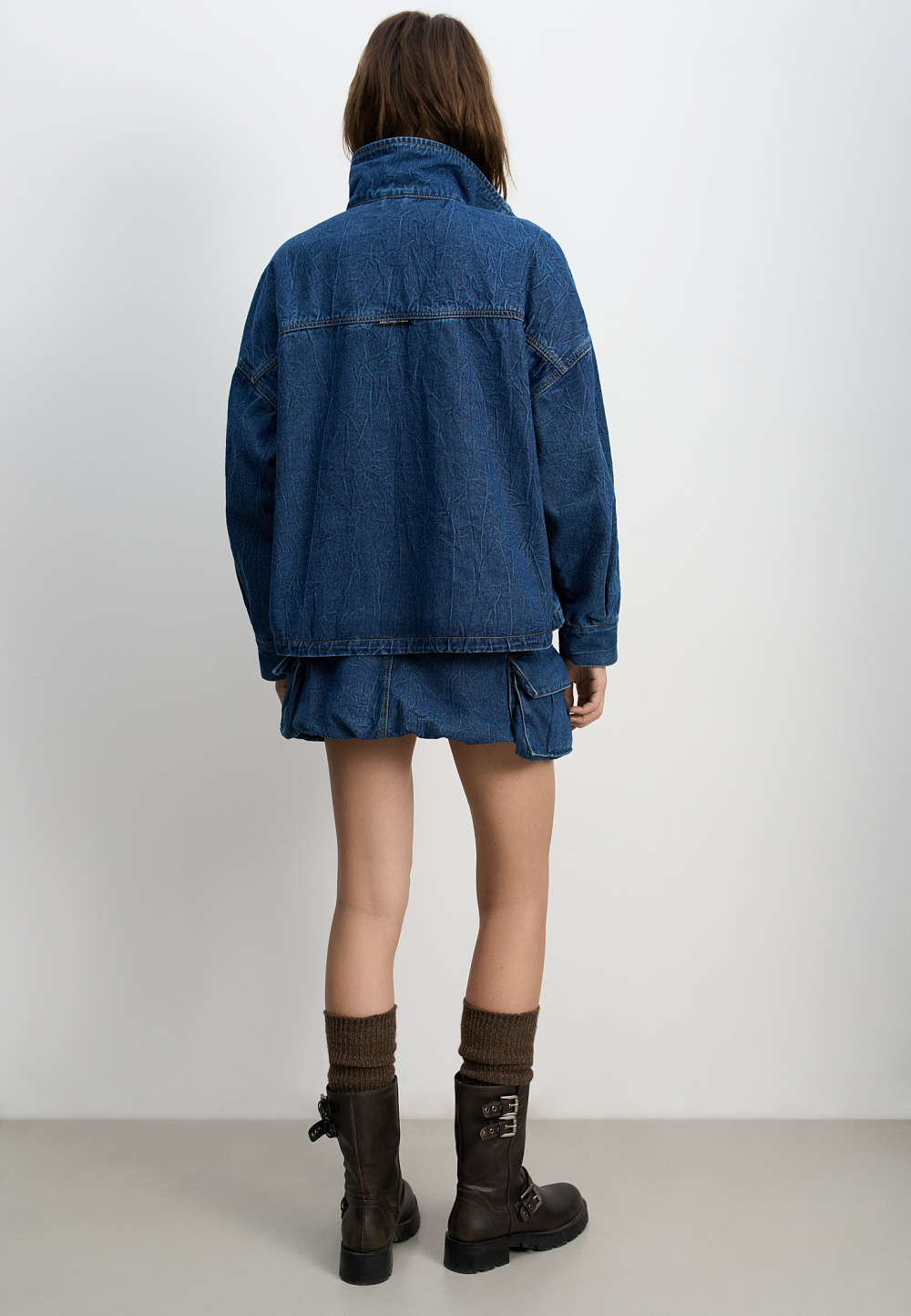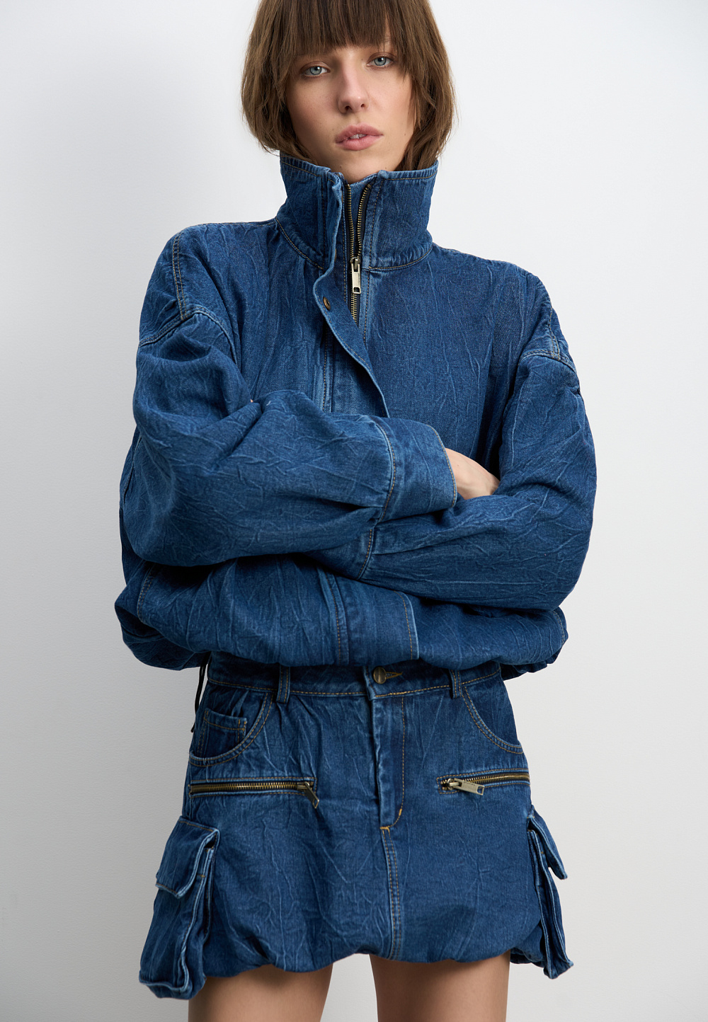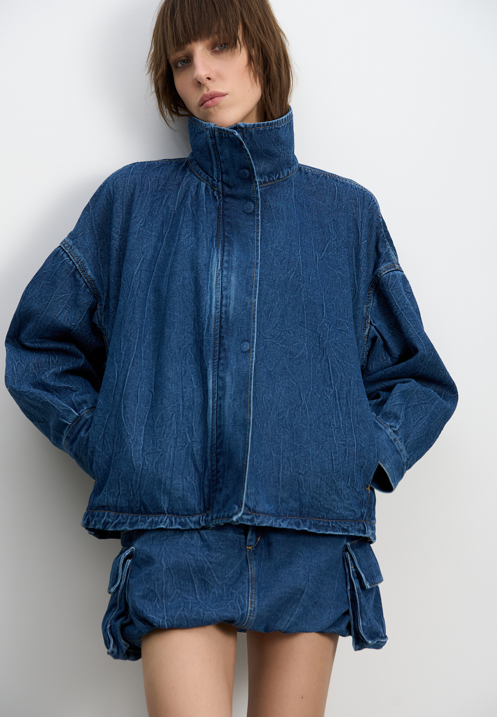 Denim bomber made of 100% cotton with a wringed texture. The model has a loose silhouette with a lowered shoulder line, a stand collar, an adjustable drawstring at the bottom, and a zip closure under the placket with hidden buttons.
