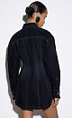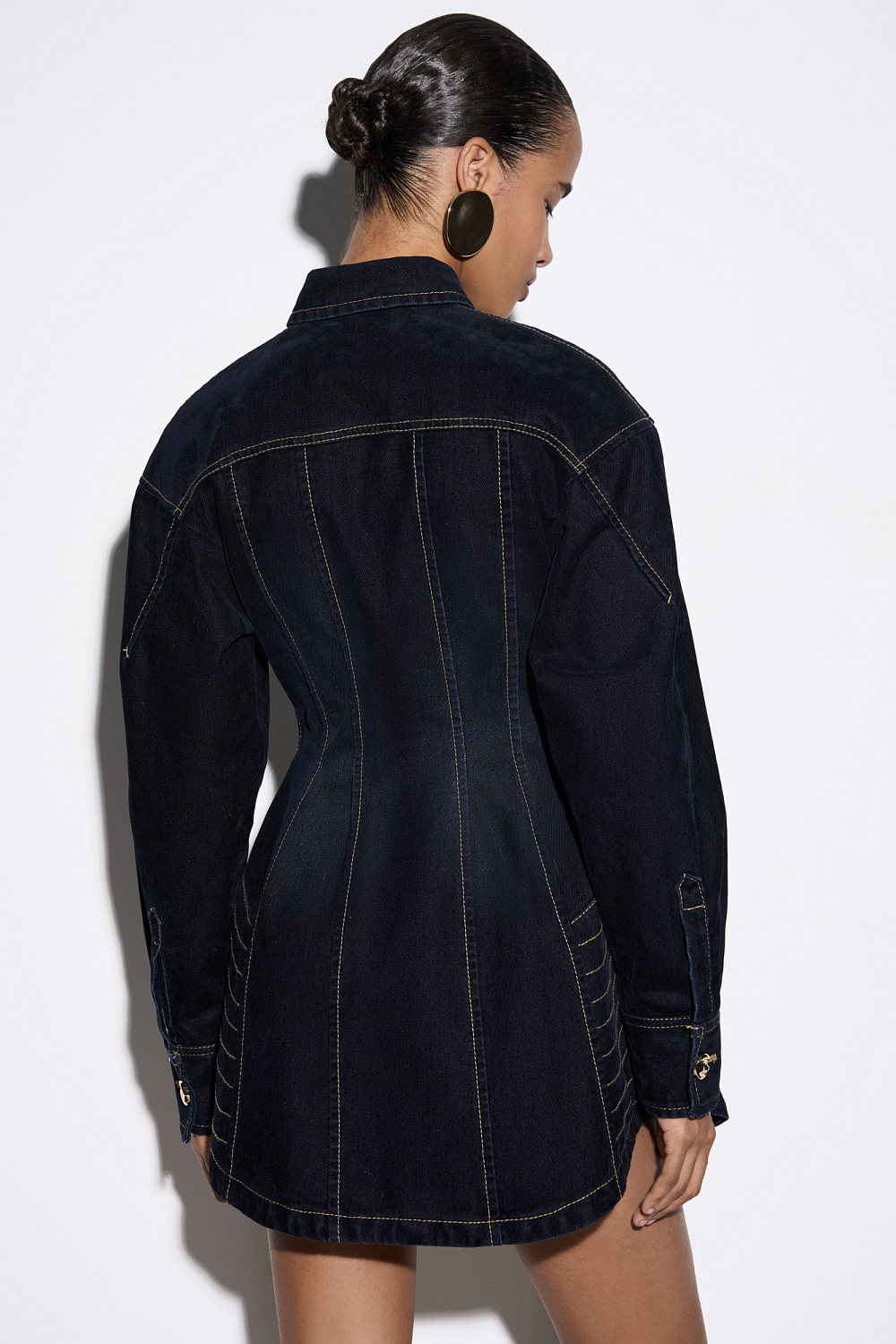 Mini-length dress made of flocked denim - 100% cotton with an imitation velvet texture. The model has a fitted silhouette with accent stitching, long sleeves and a turn-down collar. Fastening with decorative buttons.