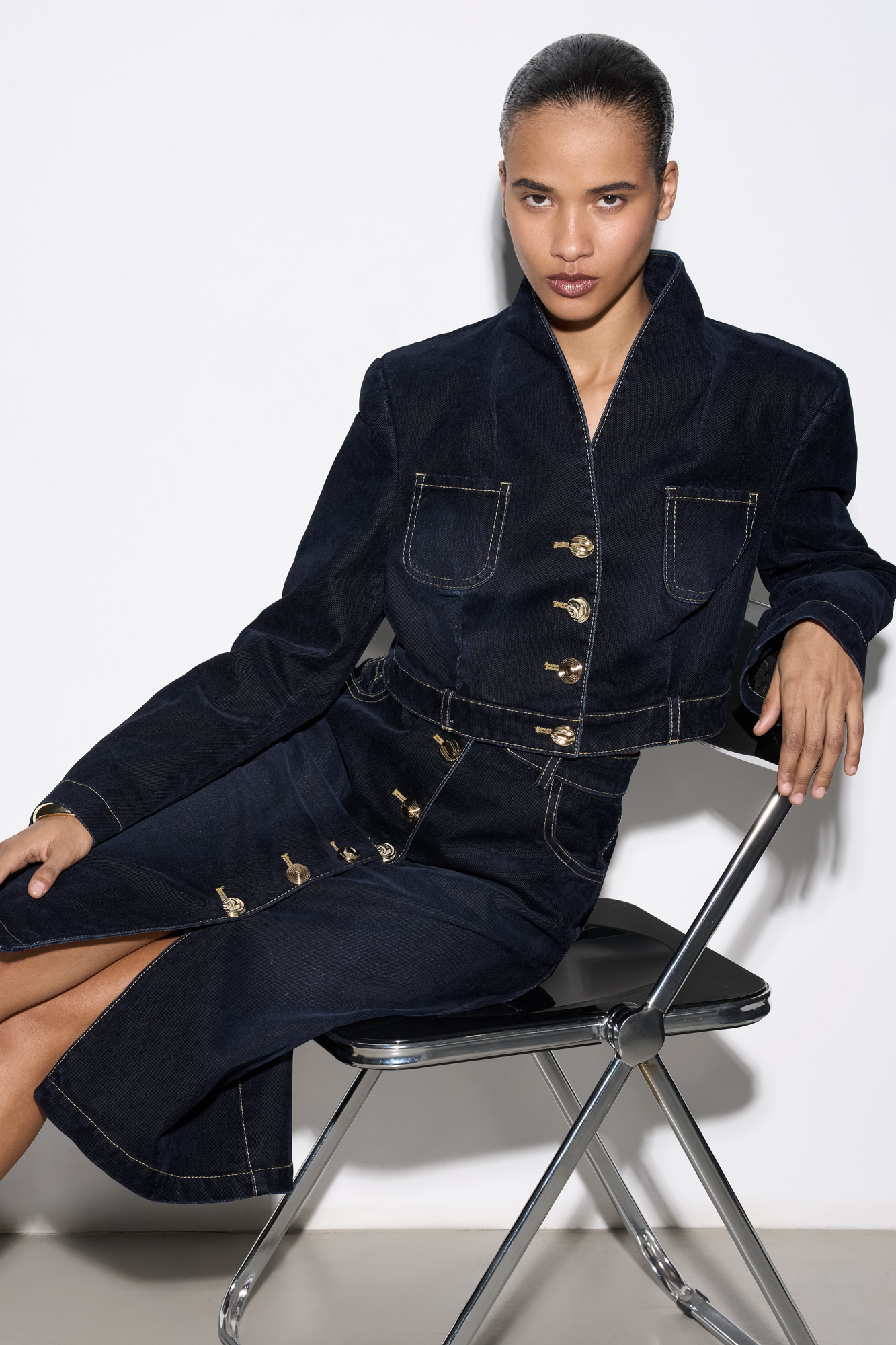 Midi-length skirt made of flocked denim - 100% cotton with an imitation velvet texture. Straight silhouette model with pockets and decorative button closure.