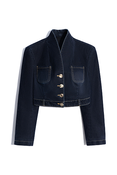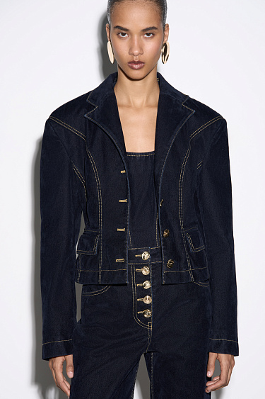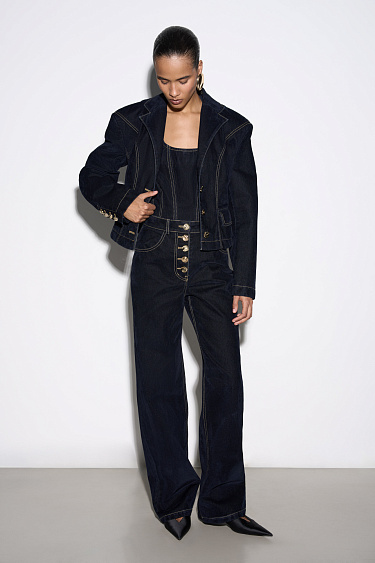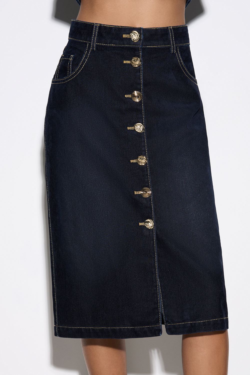 Midi-length skirt made of flocked denim - 100% cotton with an imitation velvet texture. Straight silhouette model with pockets and decorative button closure.