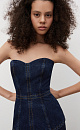 Denim corset made of 100% cotton. The model has a textured bodice and a flared silhouette. The product is decorated with contrasting stitching. It has a zipper on the back.