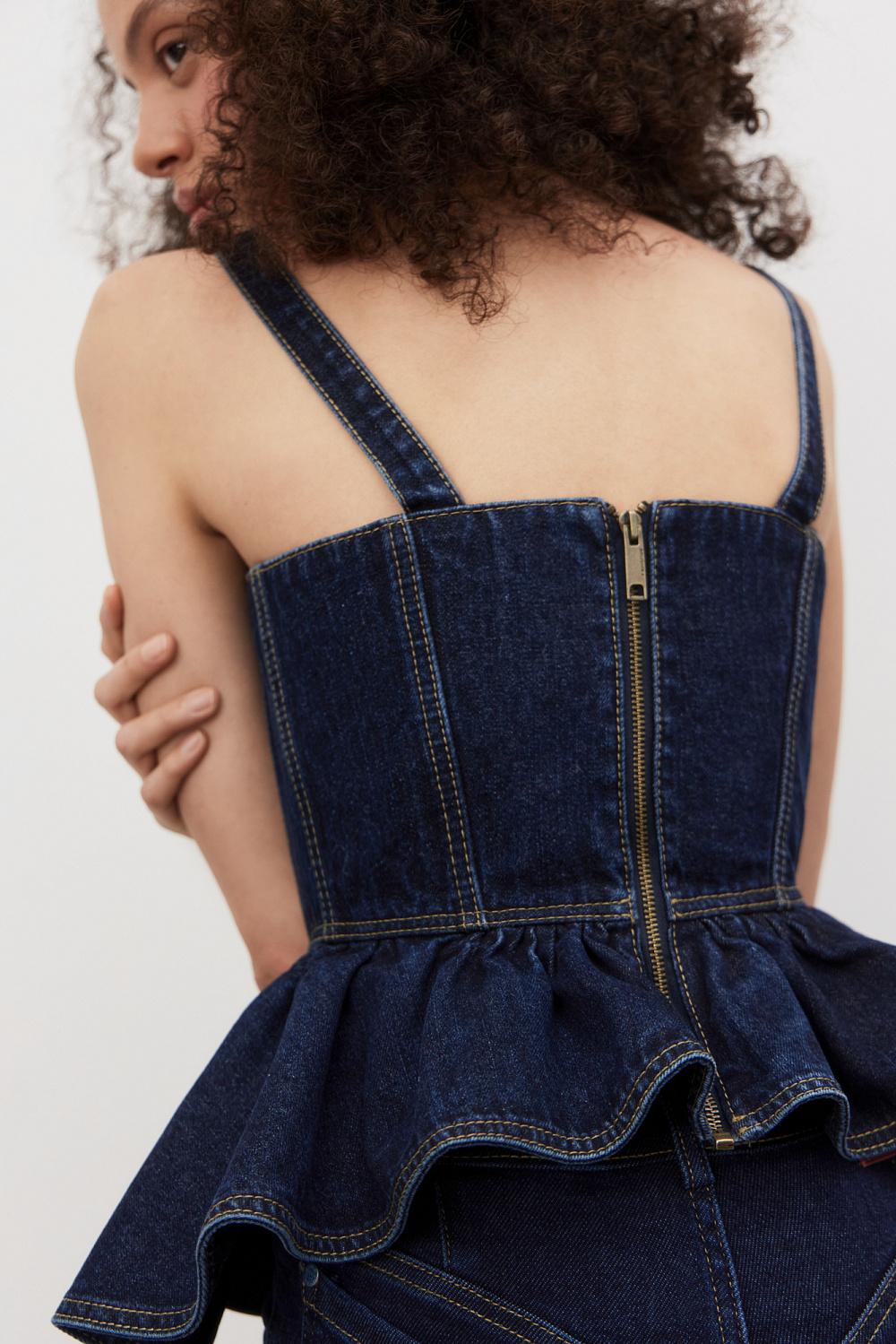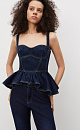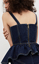 Denim top made of 100% cotton. The model has a fitted silhouette with wide straps, a figured bodice, accent stitching and a peplum. Zip fastening at the back.