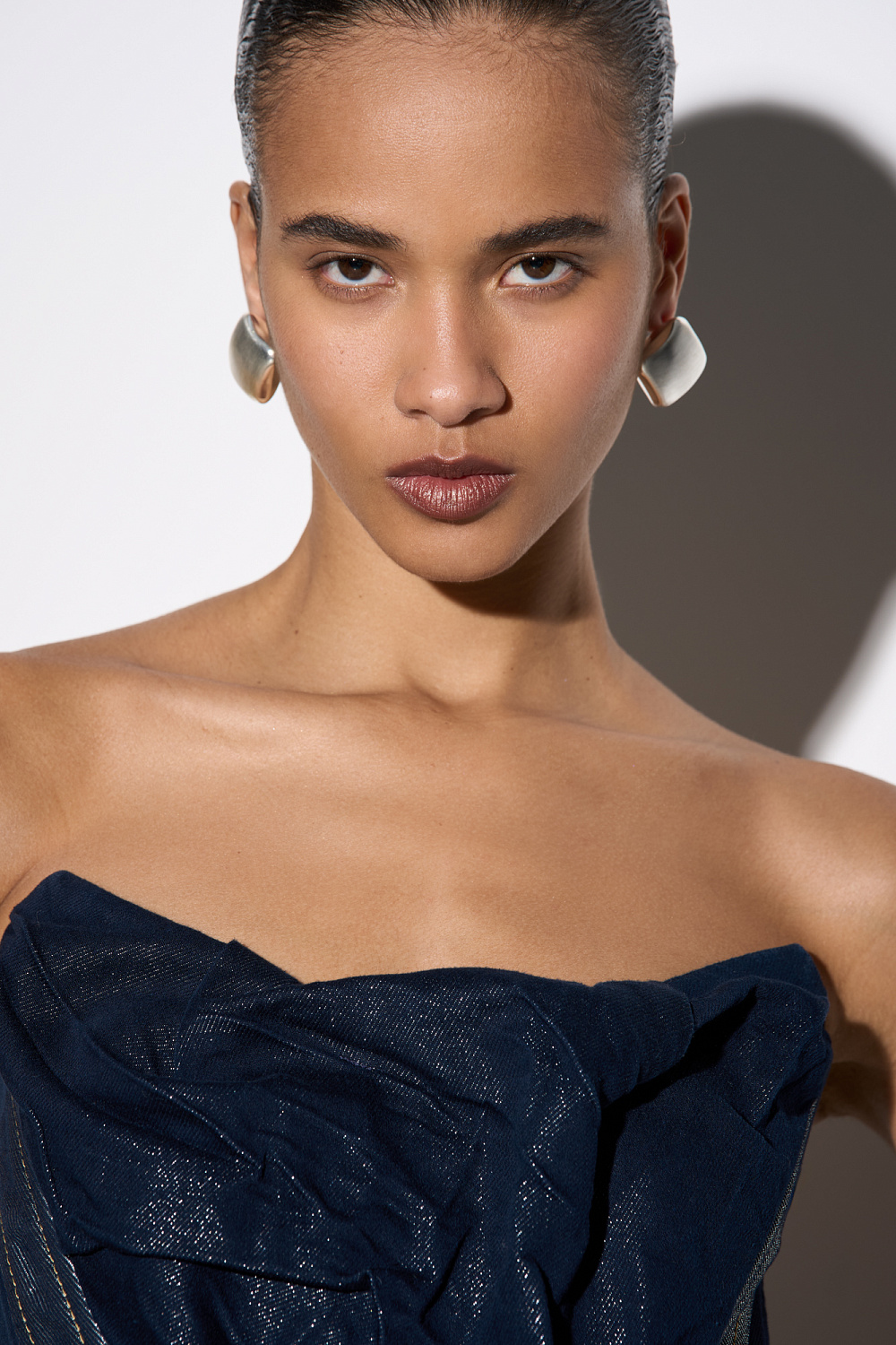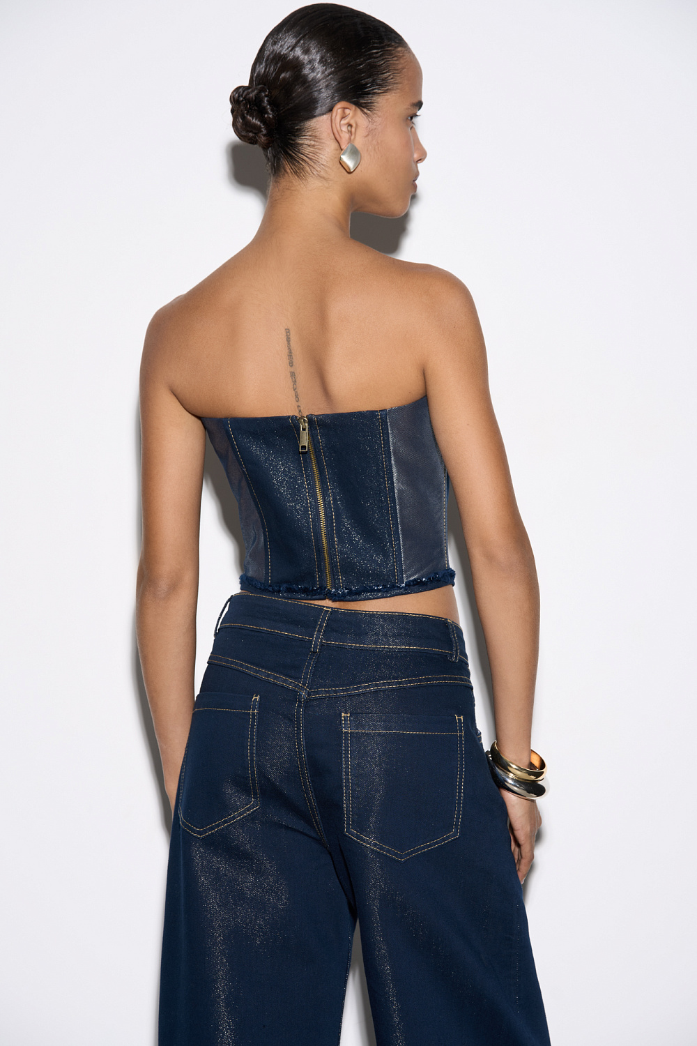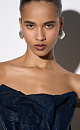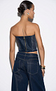 Denim corset with metallic thread. The model is strapless, with a figured neckline and voluminous decor. Zip closure.