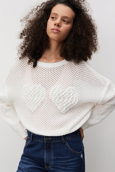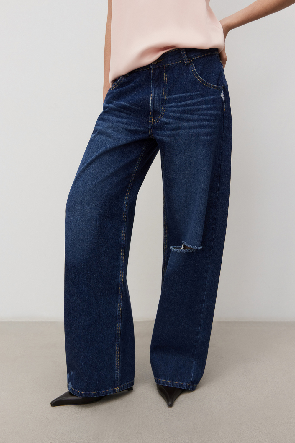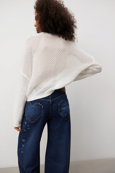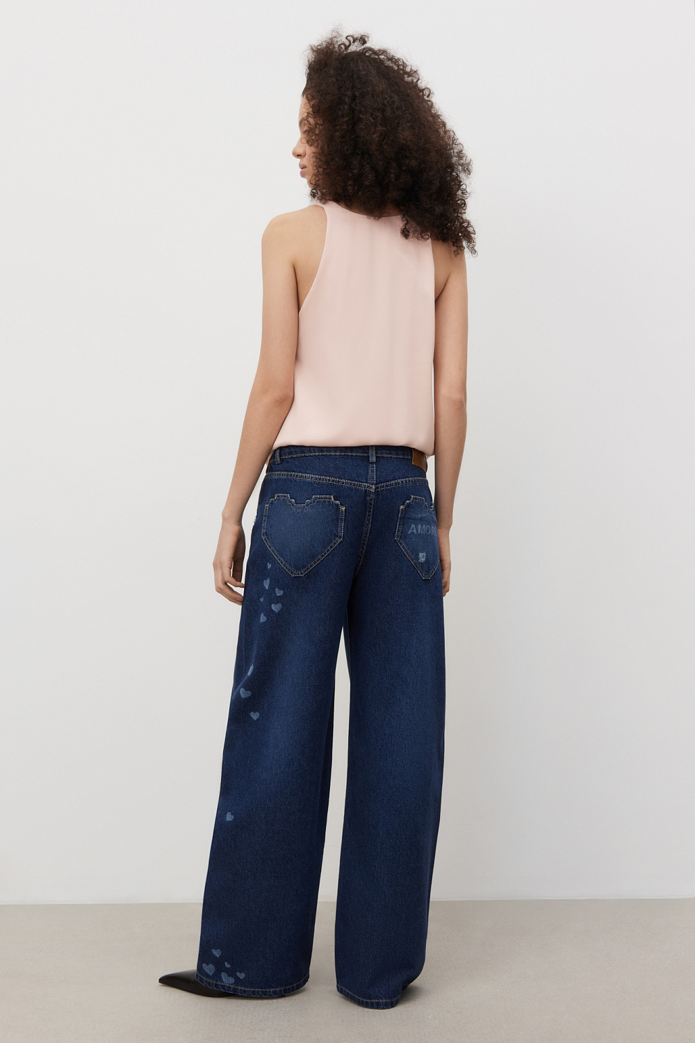 Mid-rise straight jeans with a cut and imitation of hearts. Zip and button fastening.