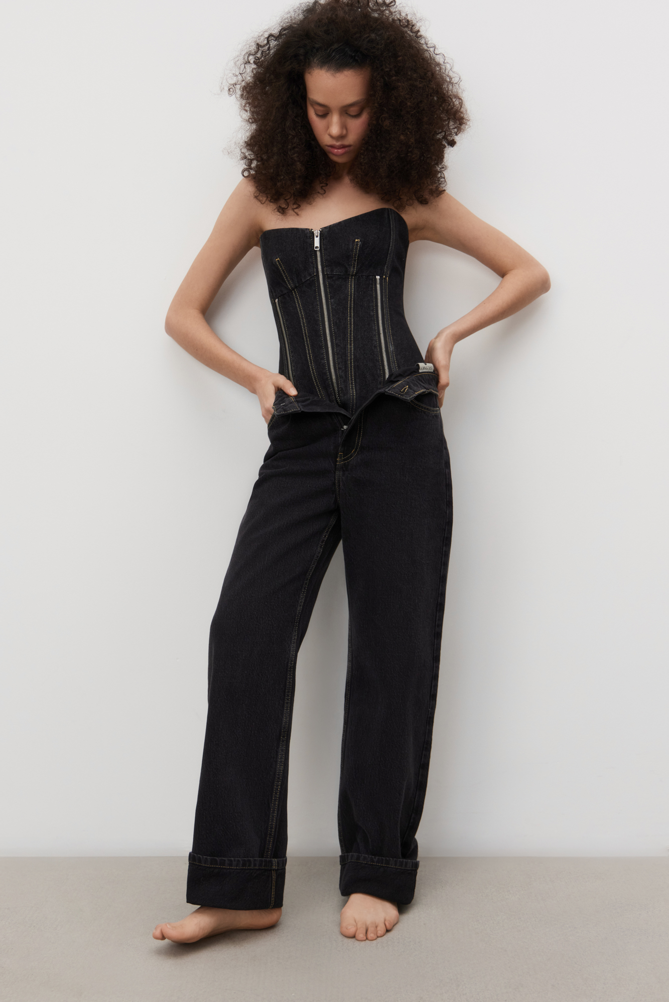 100% cotton jeans. The model has a straight, wide fit, a classic fit, five pockets, belt loops and a zipper and button closure. The effect of “marble” washing over the entire surface. Small pocket trimmed in brown eco-leather.