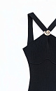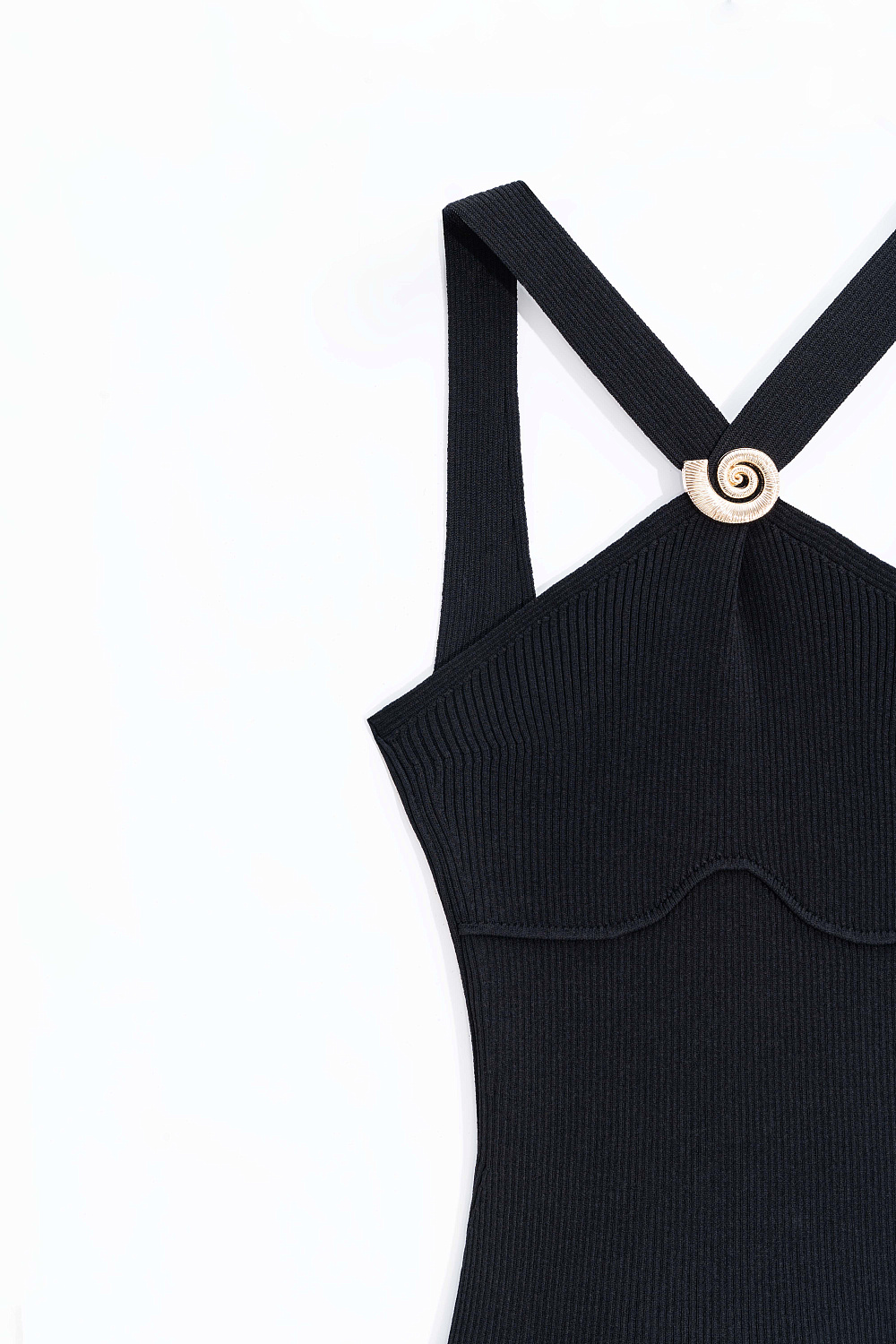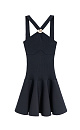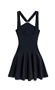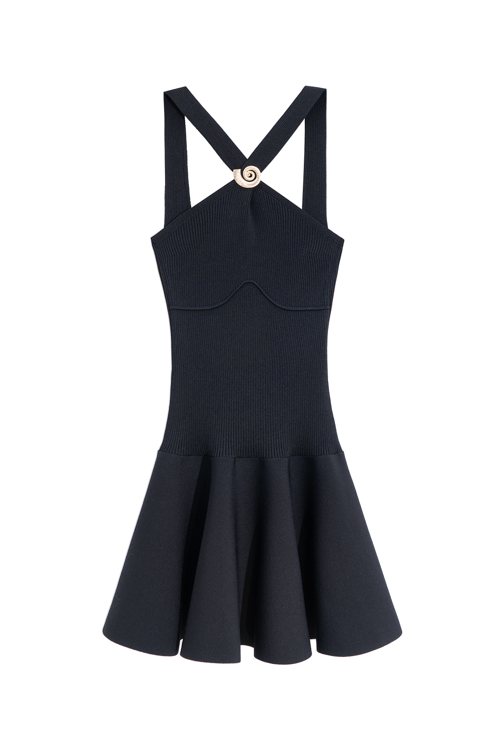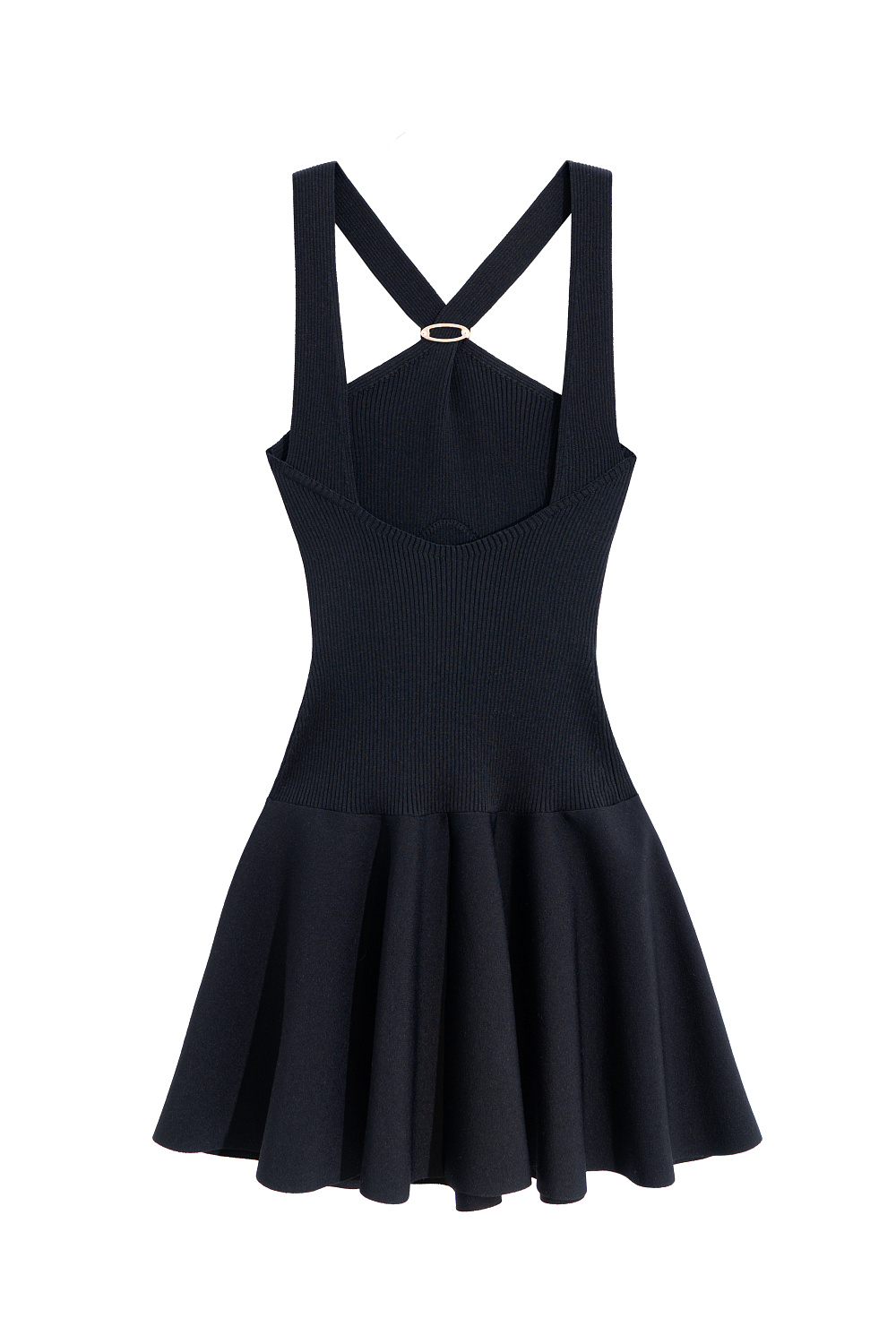 Knitted mini-length dress made of viscose. The model has a fitted silhouette with wide straps crossed on the bodice and decorated with a shell-shaped buckle. The product has an open back, a knitted bodice and a circle skirt.