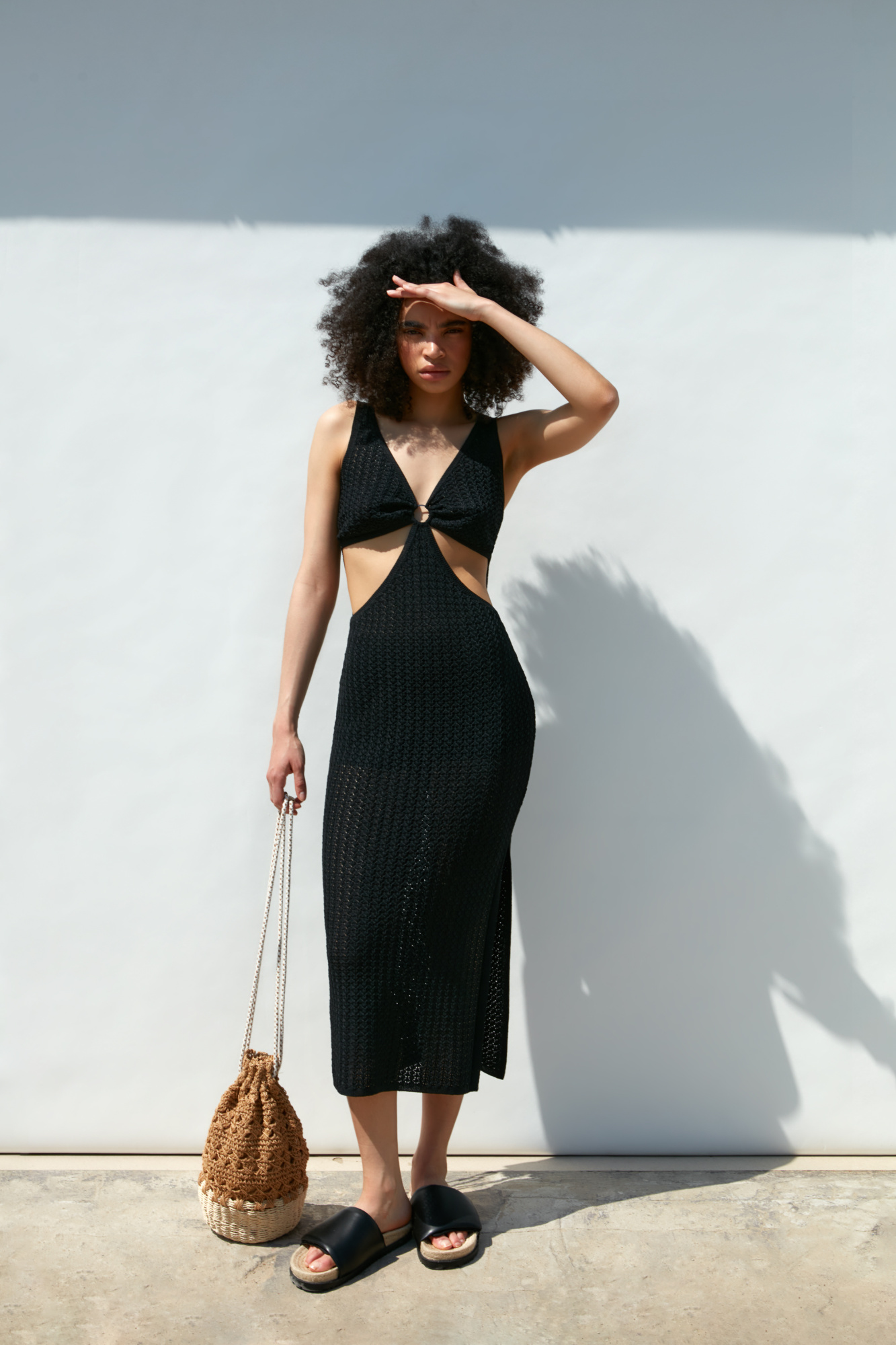 Knitted viscose dress with a side slit, a ring at the chest and an open back.