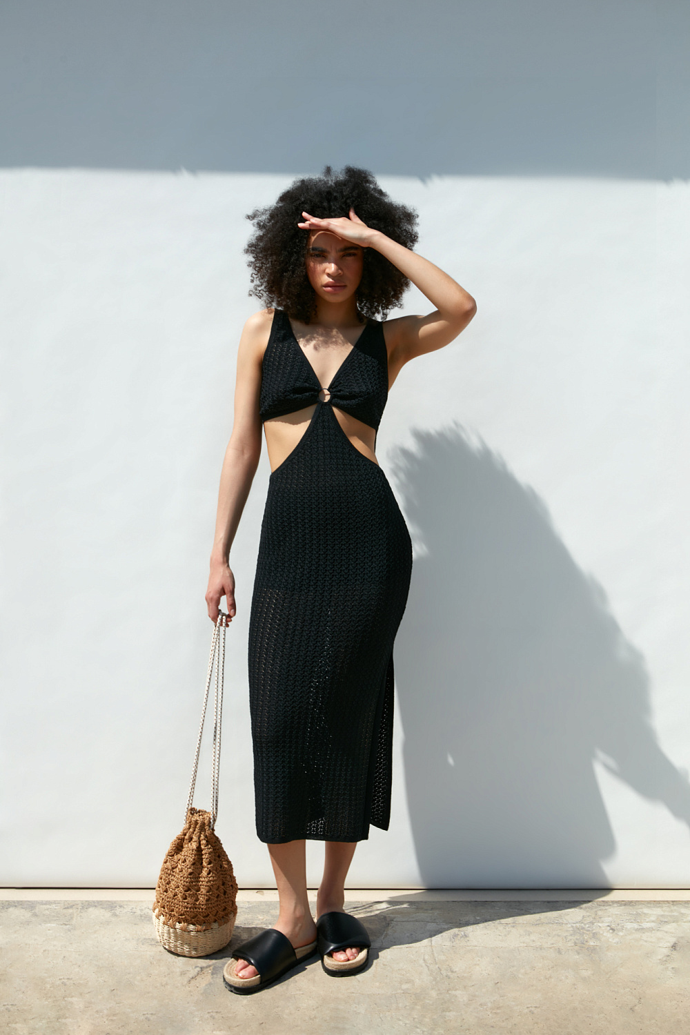 Knitted viscose dress with a side slit, a ring at the chest and an open back.