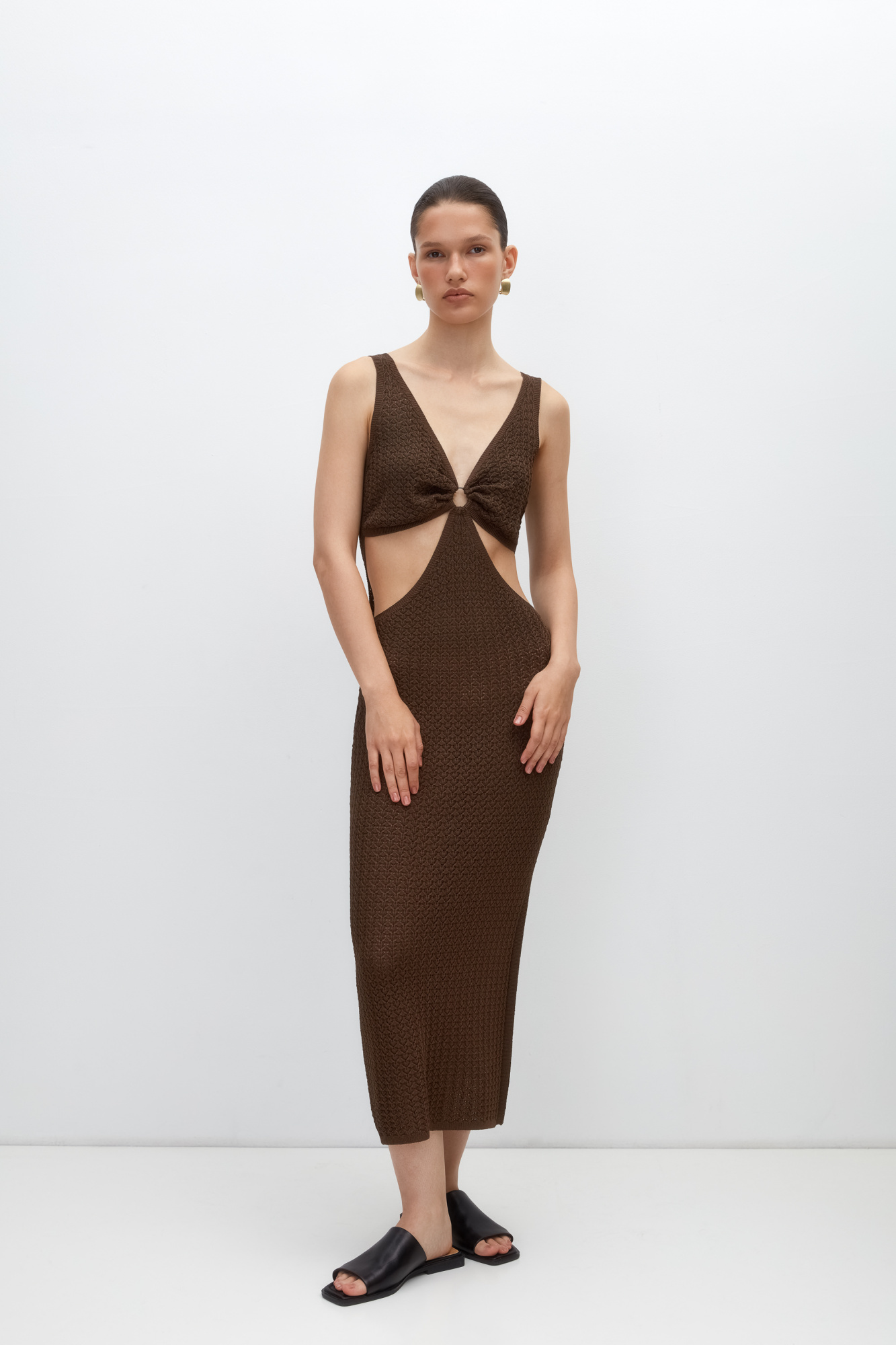 Knitted viscose dress with a side slit, a ring at the chest and an open back.