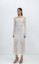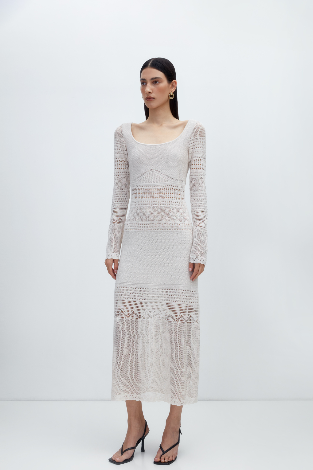Fitted viscose openwork midi dress with a deep round neckline and long sleeves. Unlined. Be careful with accessories, they may leave puffs or pellets.