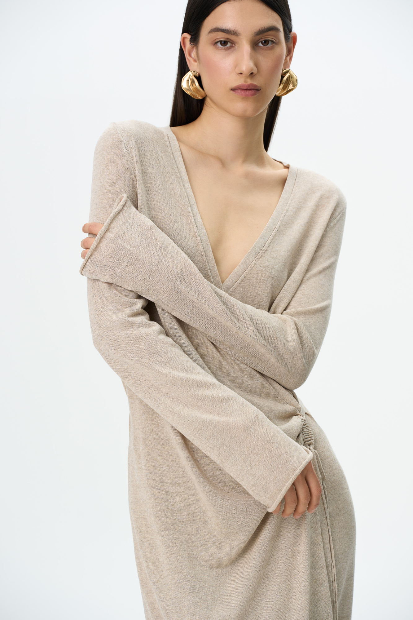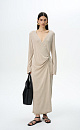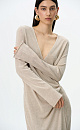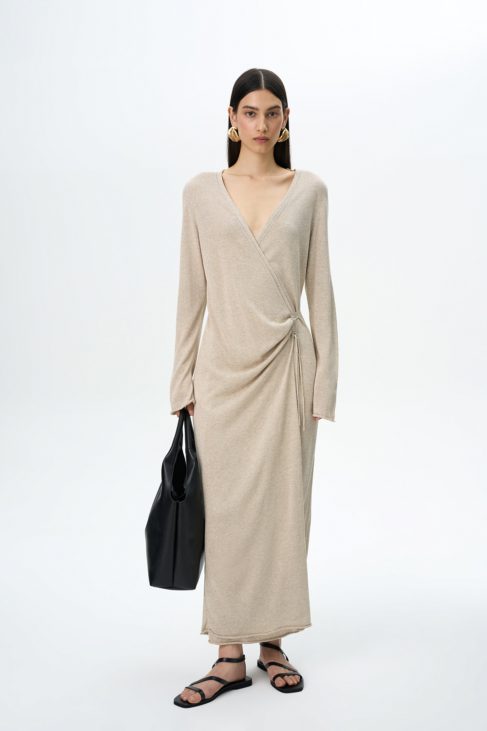 Knit calf-length wrap dress. Fitted silhouette with a V-neck and a drawstring.