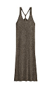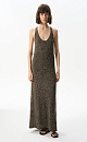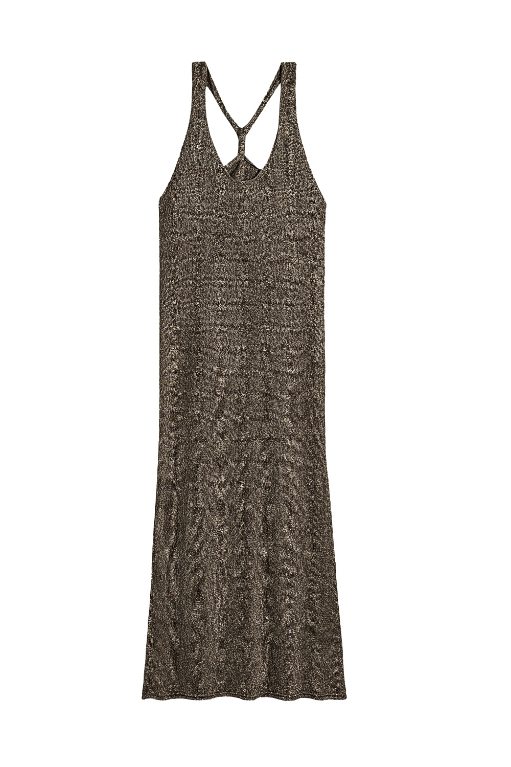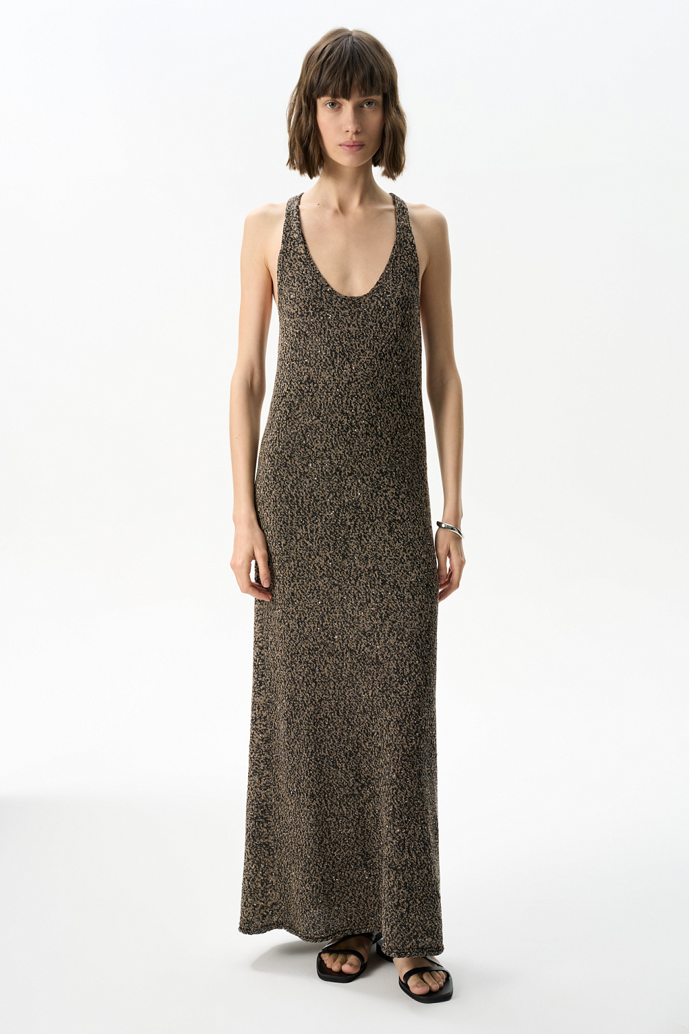 Maxi-length knitted cotton sundress with sequins. The model has a loose fit, wide straps, a twist at the back and a deep U-shaped neckline.