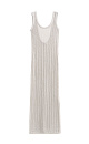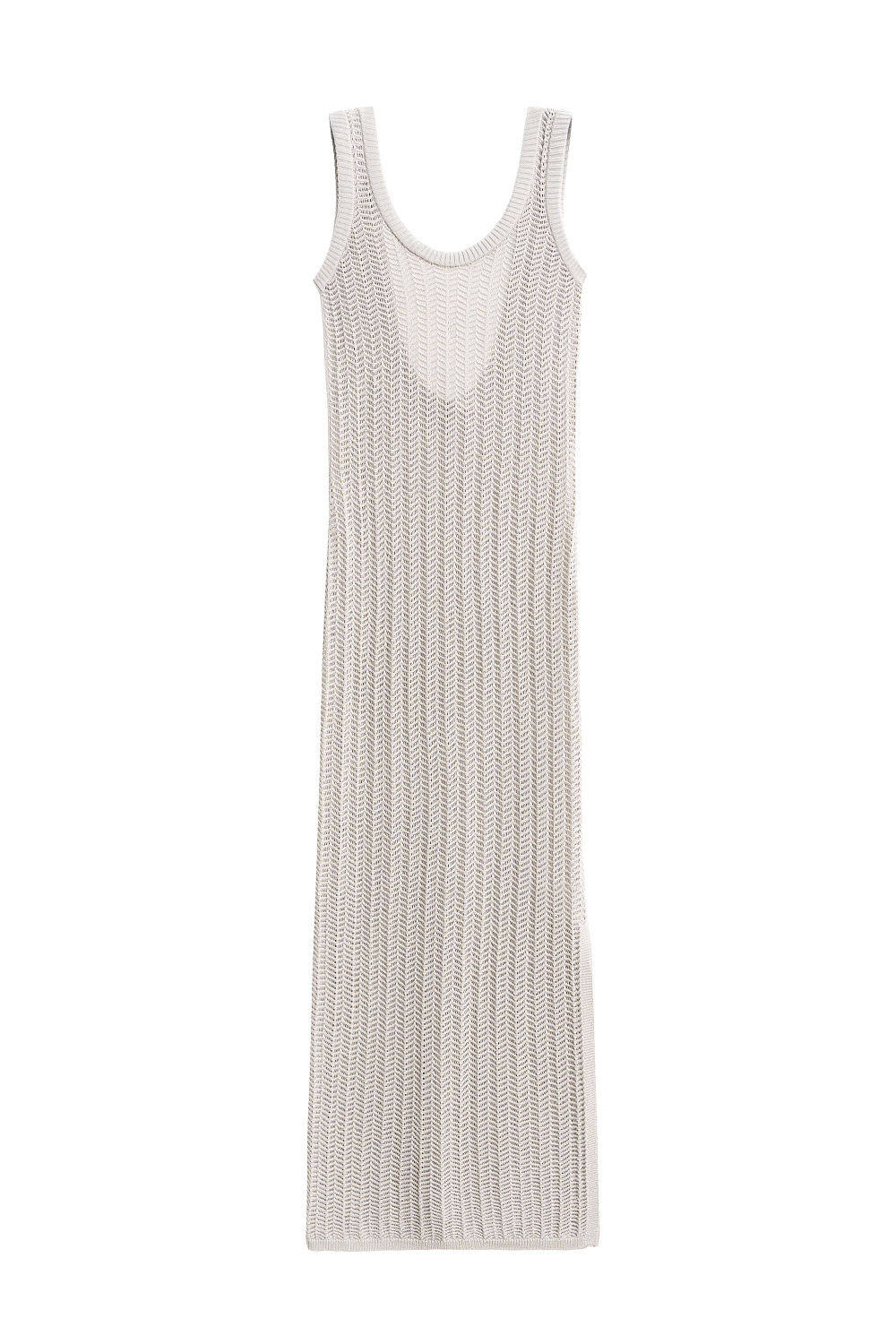 Knitted openwork sundress made of viscose. The model has a loose silhouette, sleeveless, thin straps and an open back. The knitting is made in a herringbone pattern, the edges of the product are ribbed.