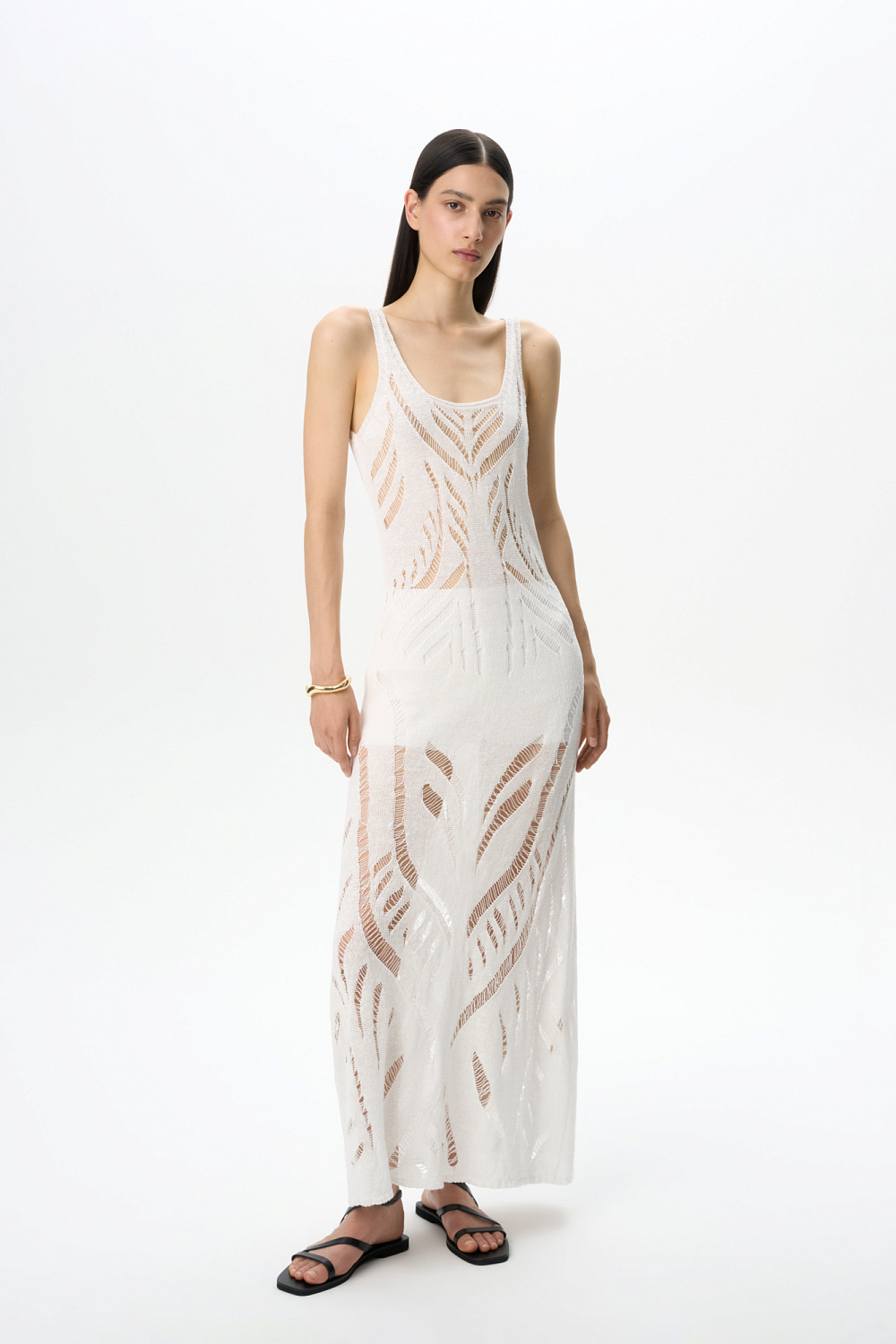 100% linen knit sundress with broaching details and an open back.
