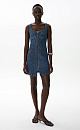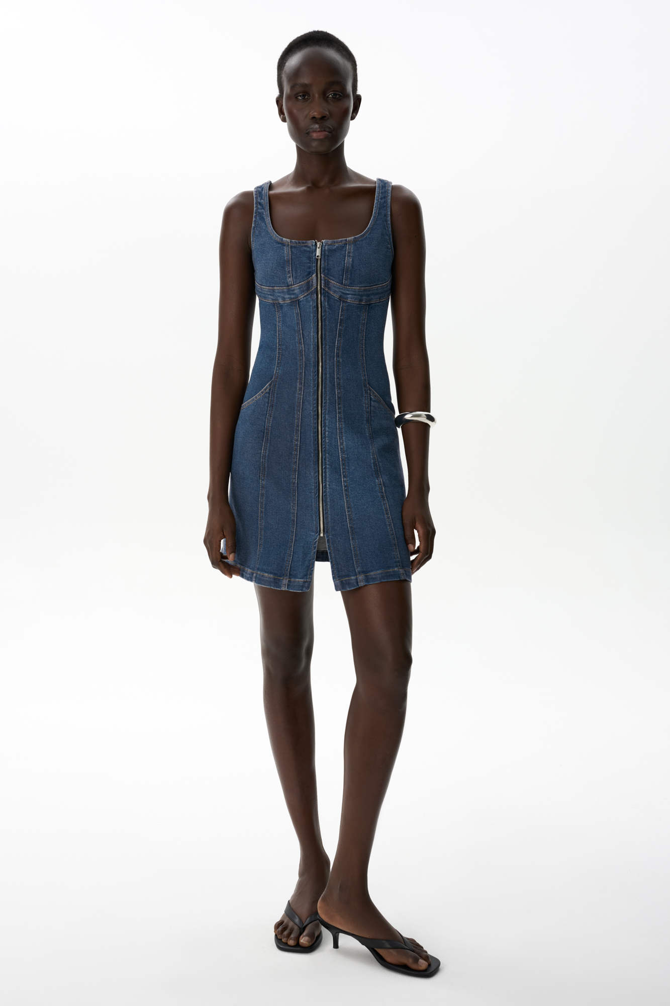 Cotton mini length denim dress. The model has a fitted silhouette with wide straps, two side pockets, back pockets and a zipper closure. The dress has a seam bodice with decorative seams.