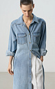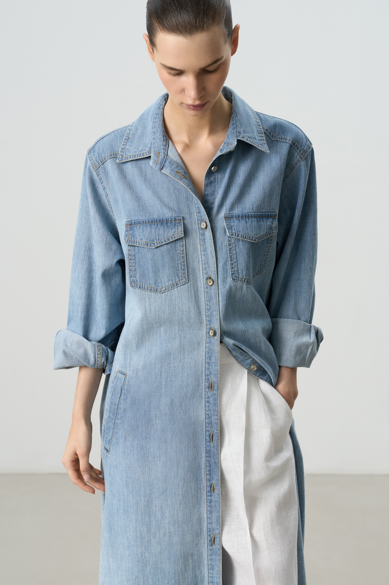 Midi length denim shirt dress made of 100% cotton. Straight-cut model with long sleeves with buttoned cuffs, turn-down collar, two patch pockets with flaps on the chest and two side pockets. Full length button closure.