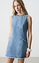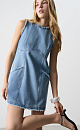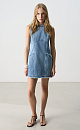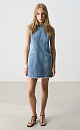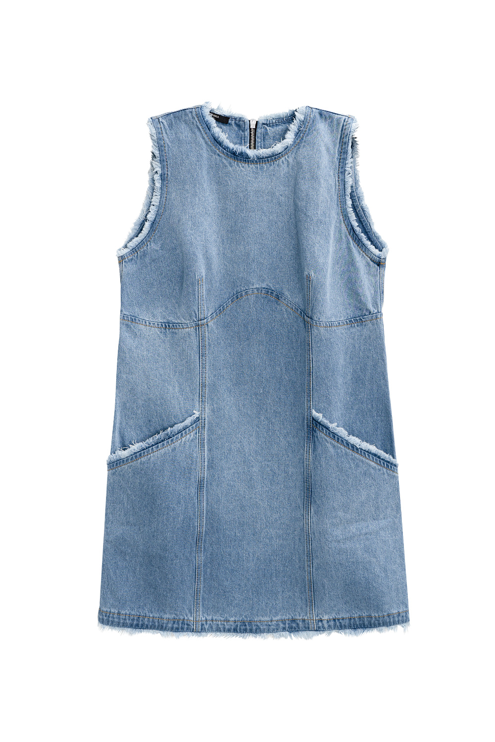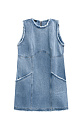 Mini length denim dress made of 100% cotton. The model is straight cut, sleeveless, with a round neckline and two patch pockets. Product with a raw edge. Zip fastening at the back.