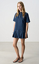 Mini-length denim dress made of 100% cotton with polka dot print. Straight cut model with pleated skirt, short sleeves, turn-down collar with magnetic button closure.