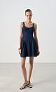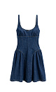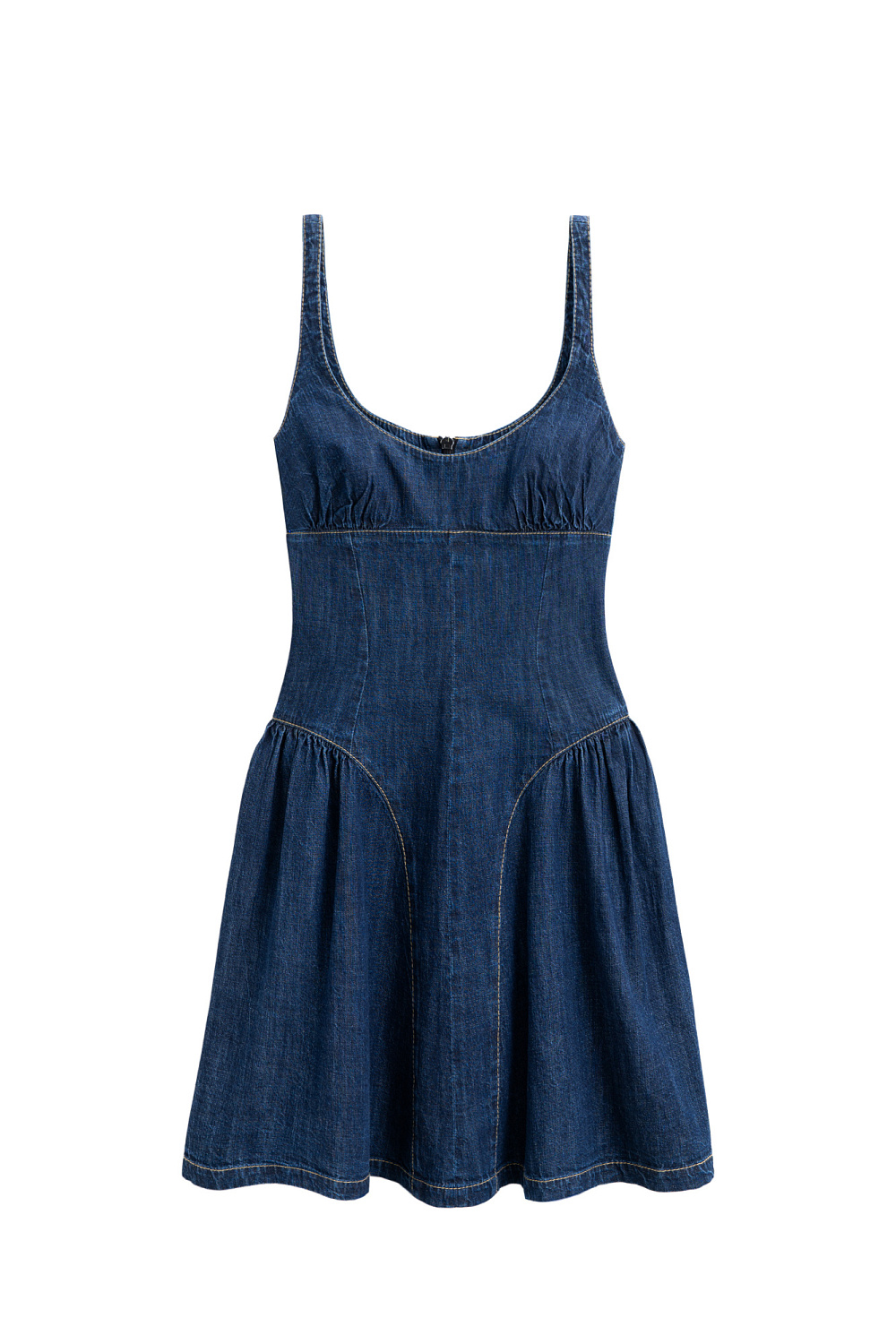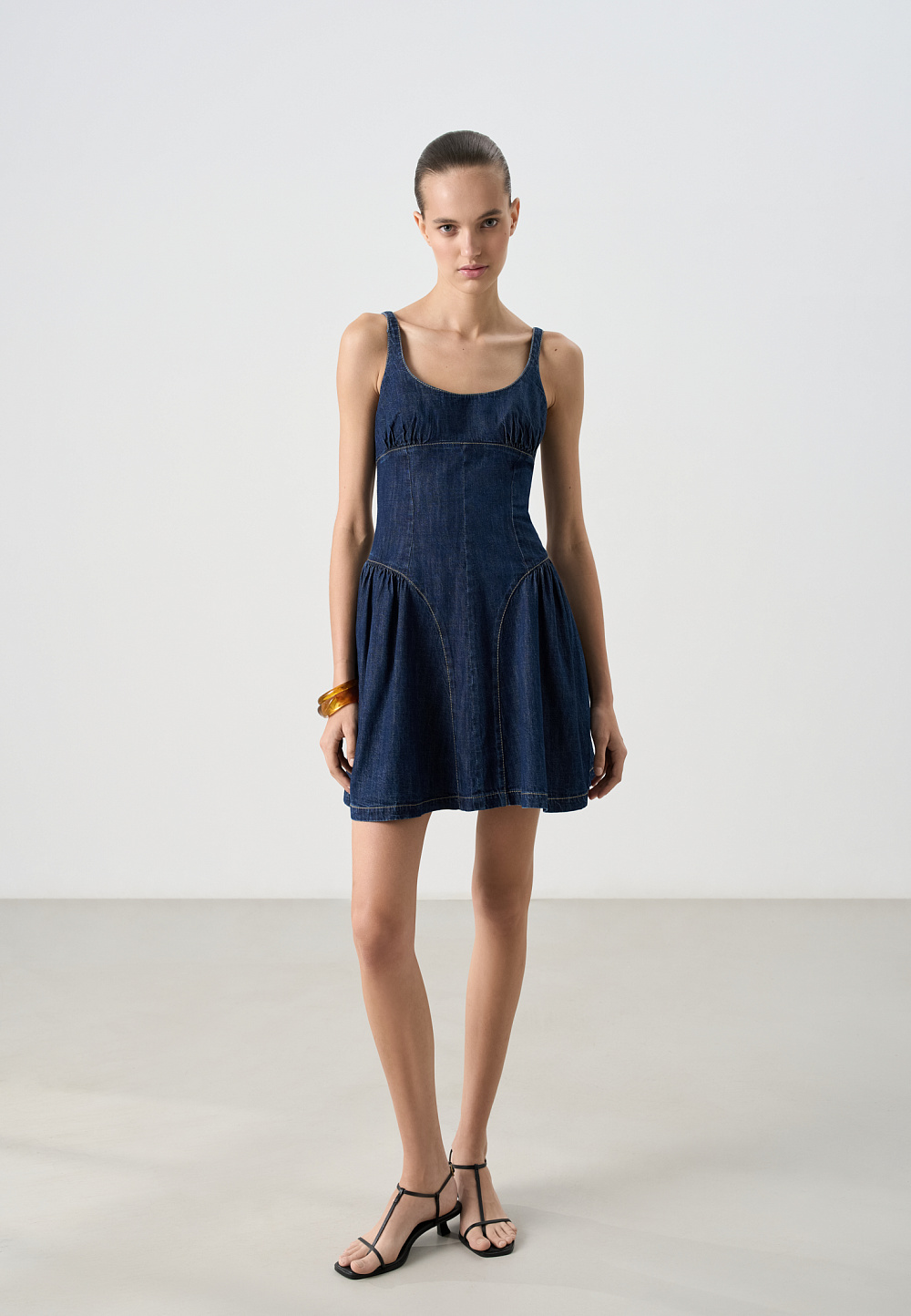 Mini length denim dress made of 100% cotton. The model has a fitted silhouette with accent darts to fit the figure, sleeveless, U-shaped neckline, thin non-adjustable straps and a flared skirt. Zip fastening at the back.