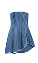 Fitted denim mini dress with ribs borrowed from corsets. Smooth neckline. Asymmetrical hem with pleats. Zip closure.