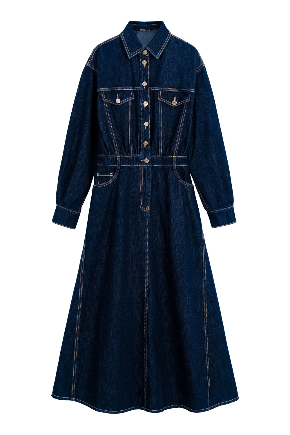 100% cotton denim dress with long sleeves. Loose silhouette model with pockets on the chest. Button closure.