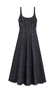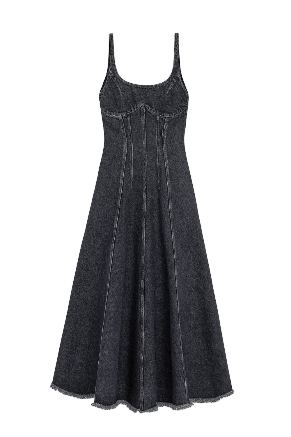 Fitted denim dress with raised seams and raw hem. Midi length.