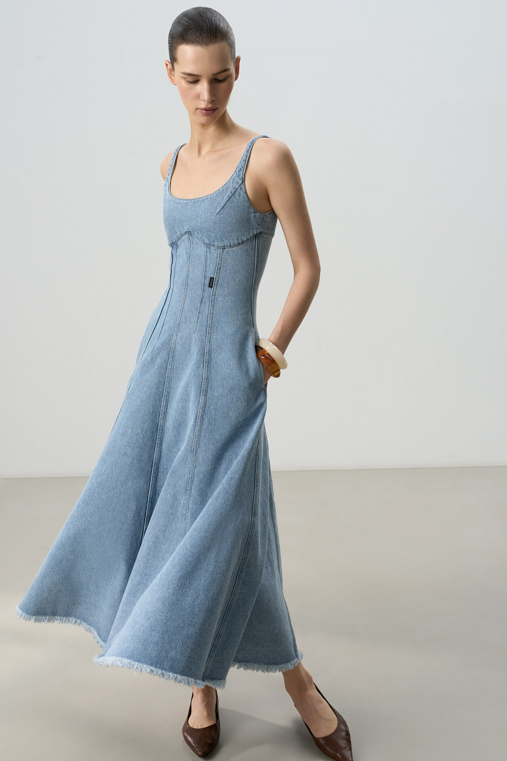 Fitted denim dress with raised seams and raw hem. Midi length.
