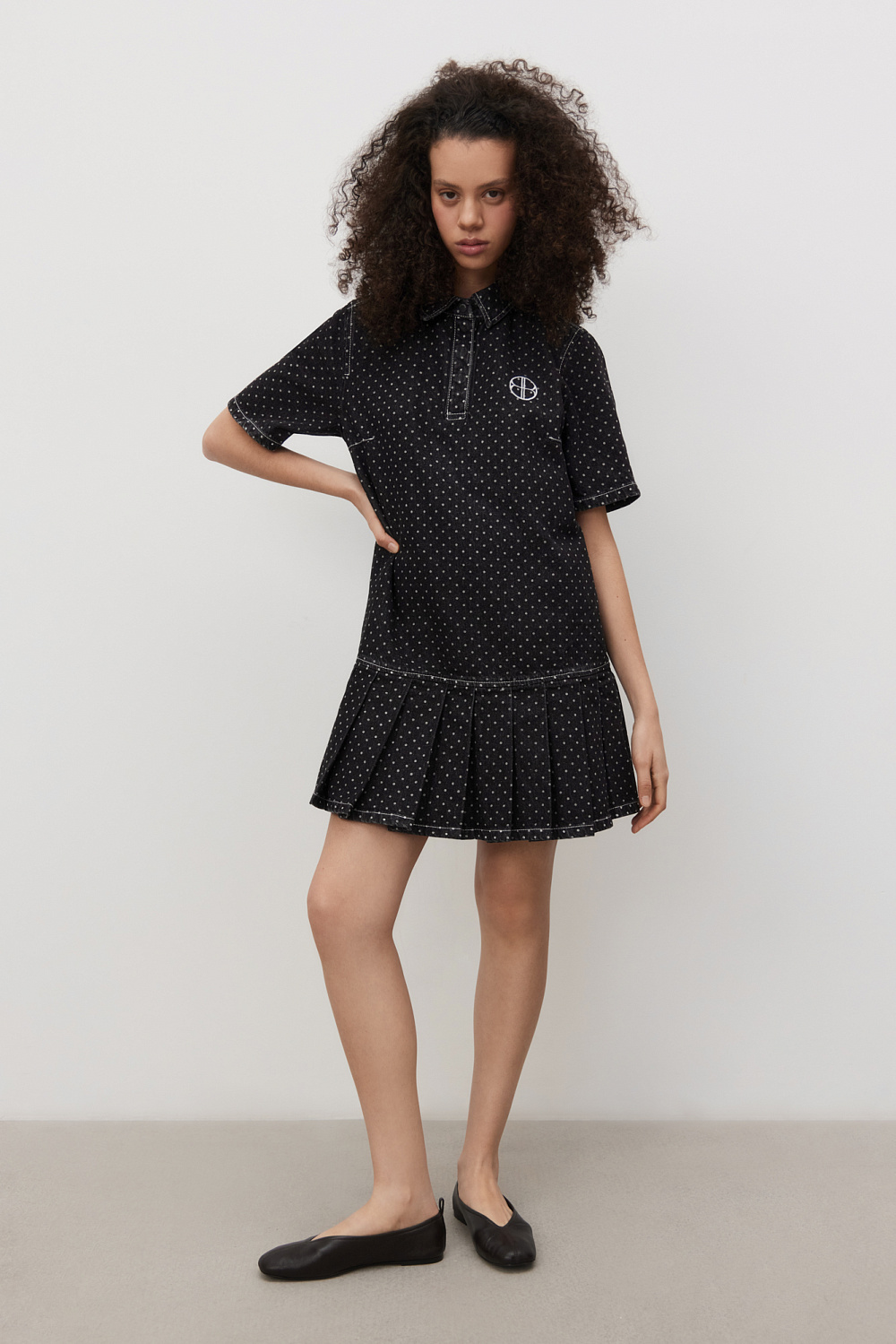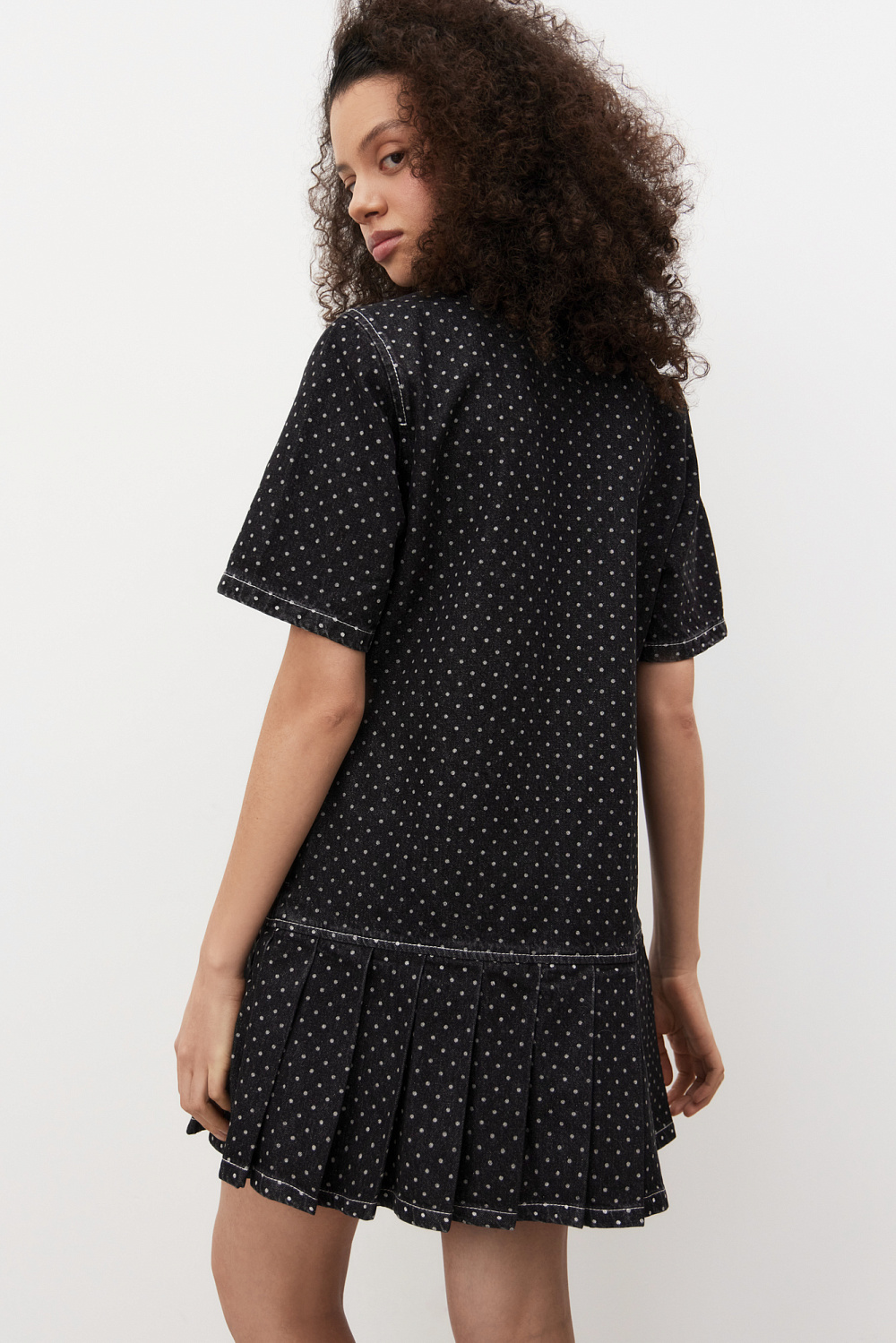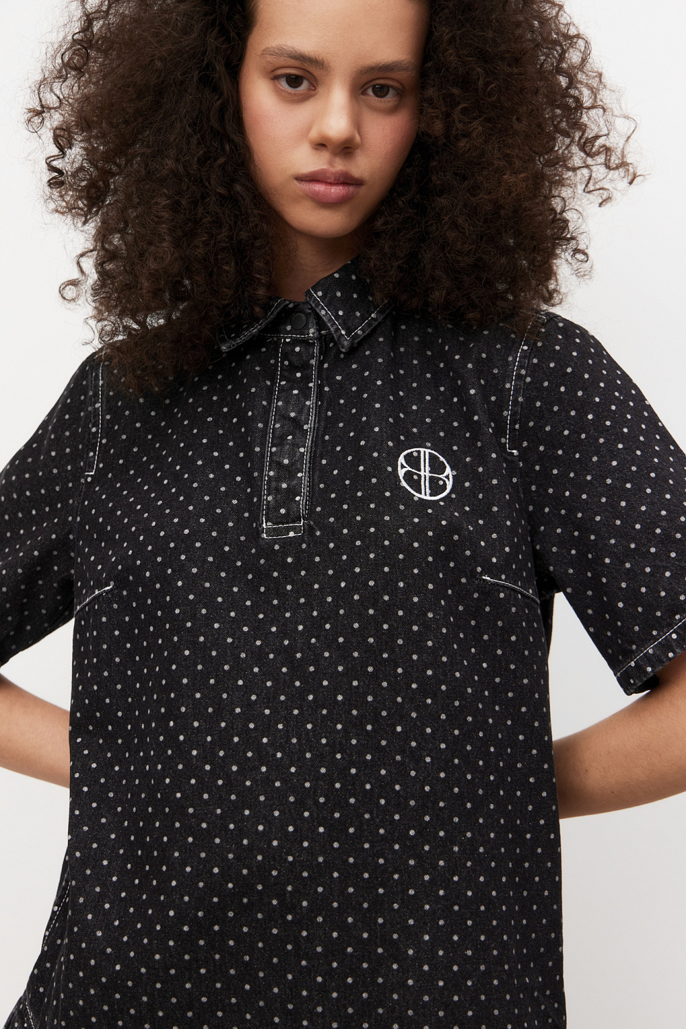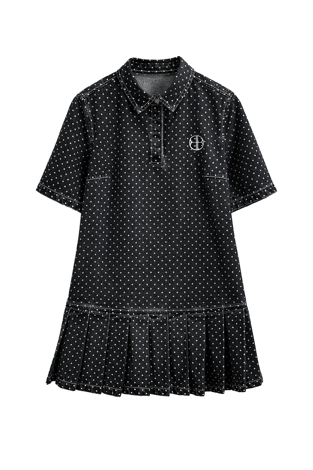Mini-length denim dress made of 100% cotton with polka dot print. Straight cut model with pleated skirt, short sleeves, turn-down collar with magnetic button closure.