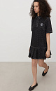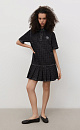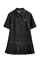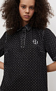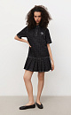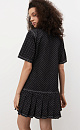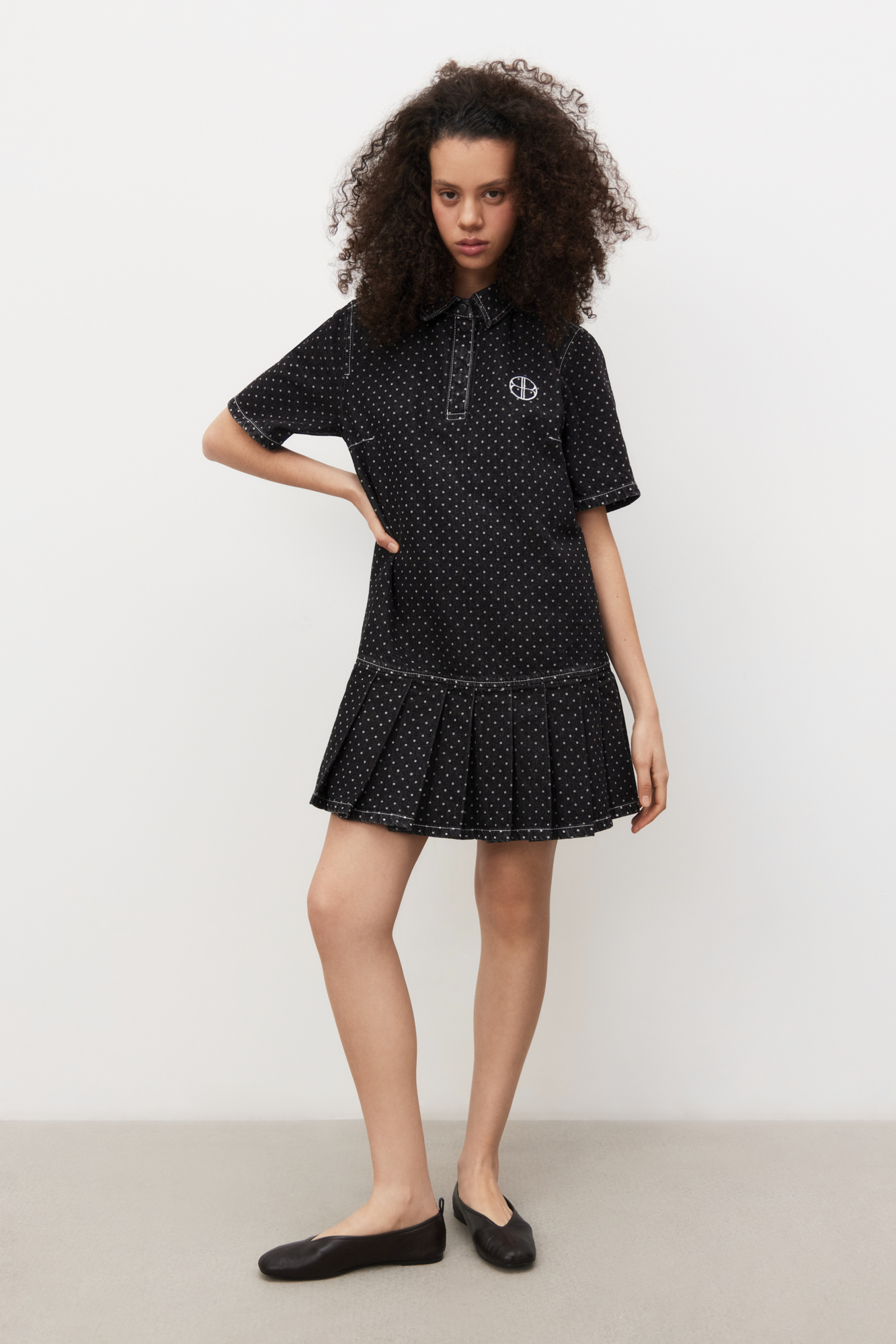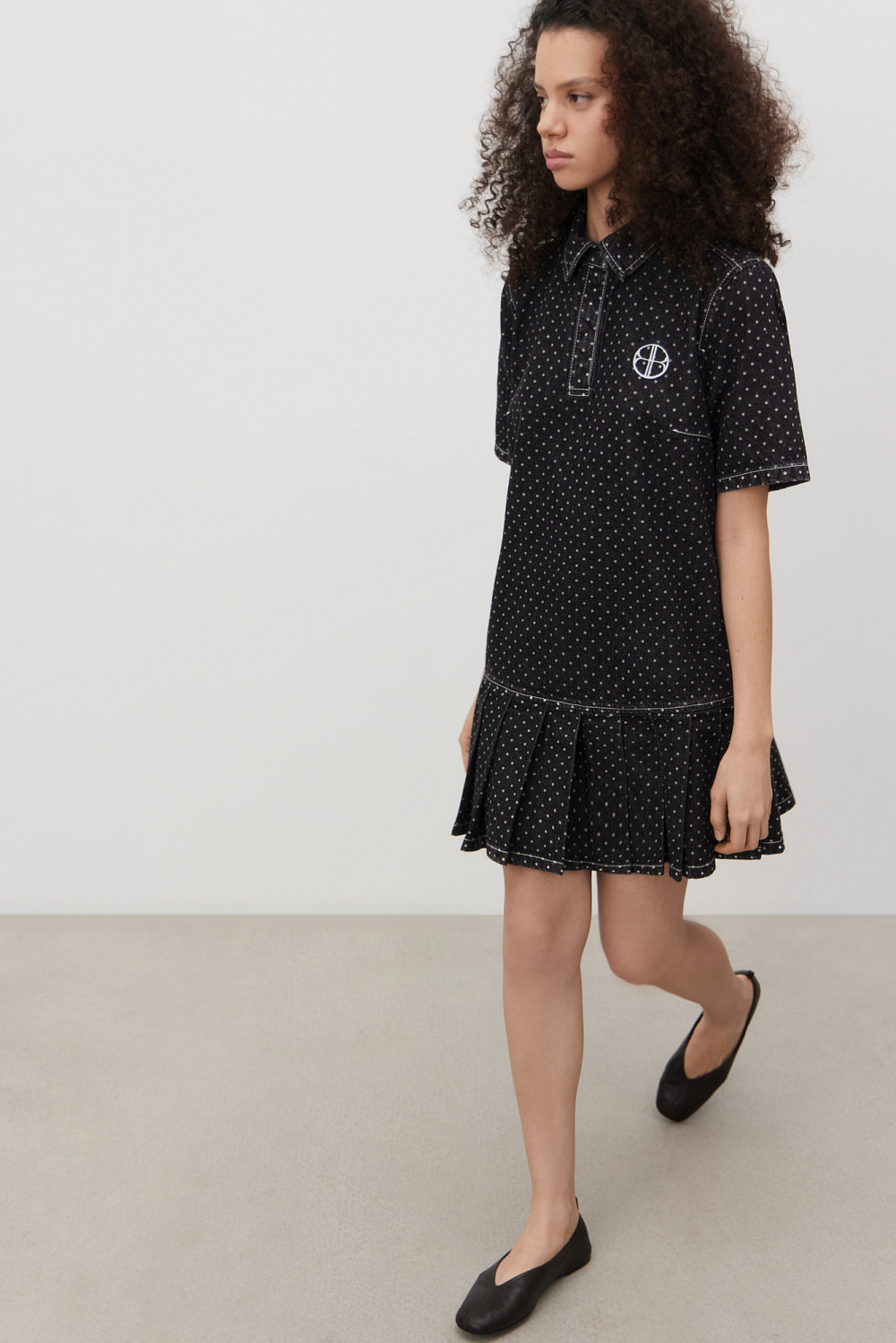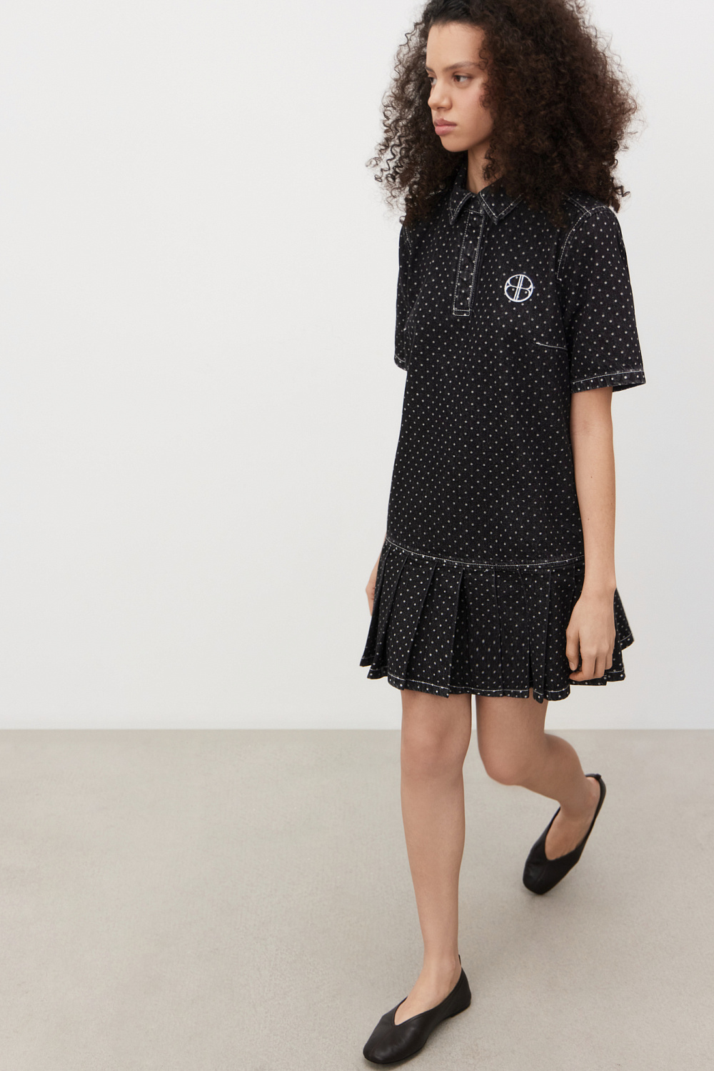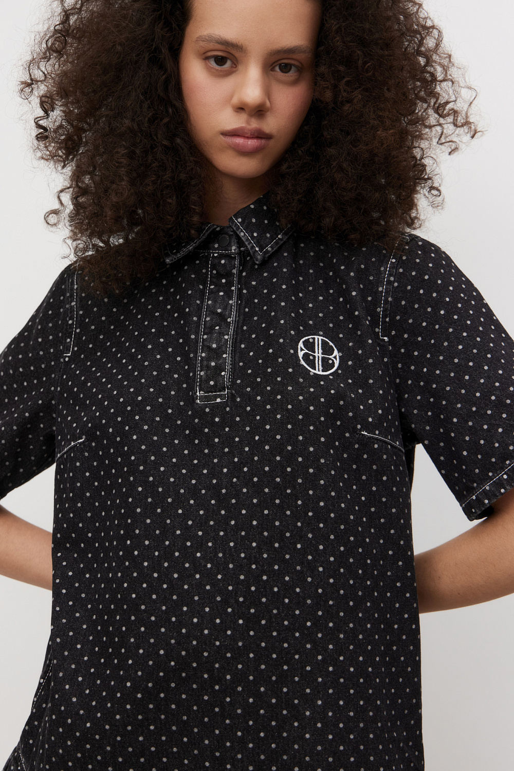 Mini-length denim dress made of 100% cotton with polka dot print. Straight cut model with pleated skirt, short sleeves, turn-down collar with magnetic button closure.