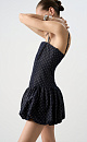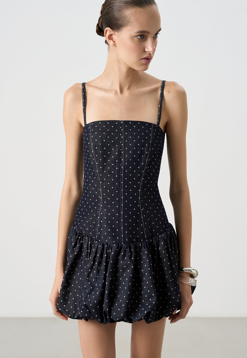 Printed denim mini sundress with balloon skirt. The model has a fitted silhouette, with a corset top, sleeveless, and thin straps. Zip fastening at the back.
