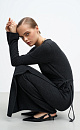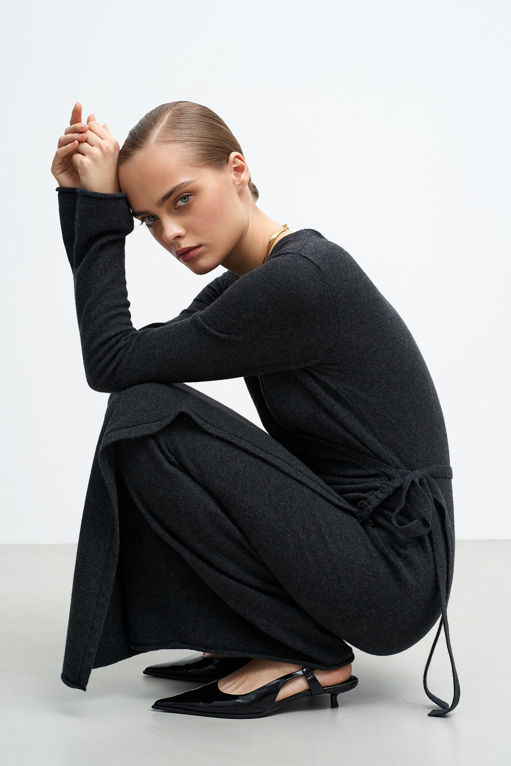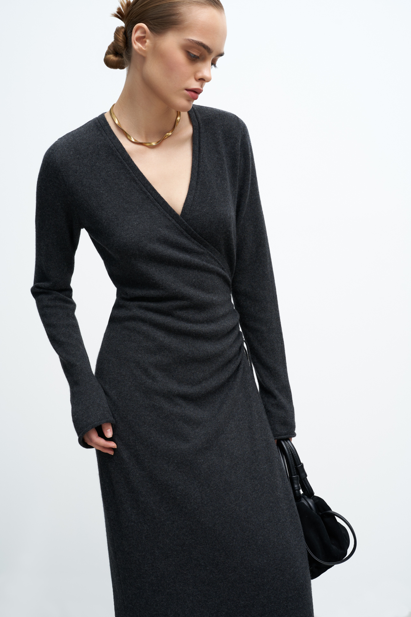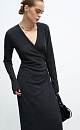 Knitted wrap dress made of wool and cashmere. The model has a fitted silhouette with a V-neck, long sleeves and a drawstring at the waist. The hem of the dress and the cuffs of the sleeves are decorated with bolsters.