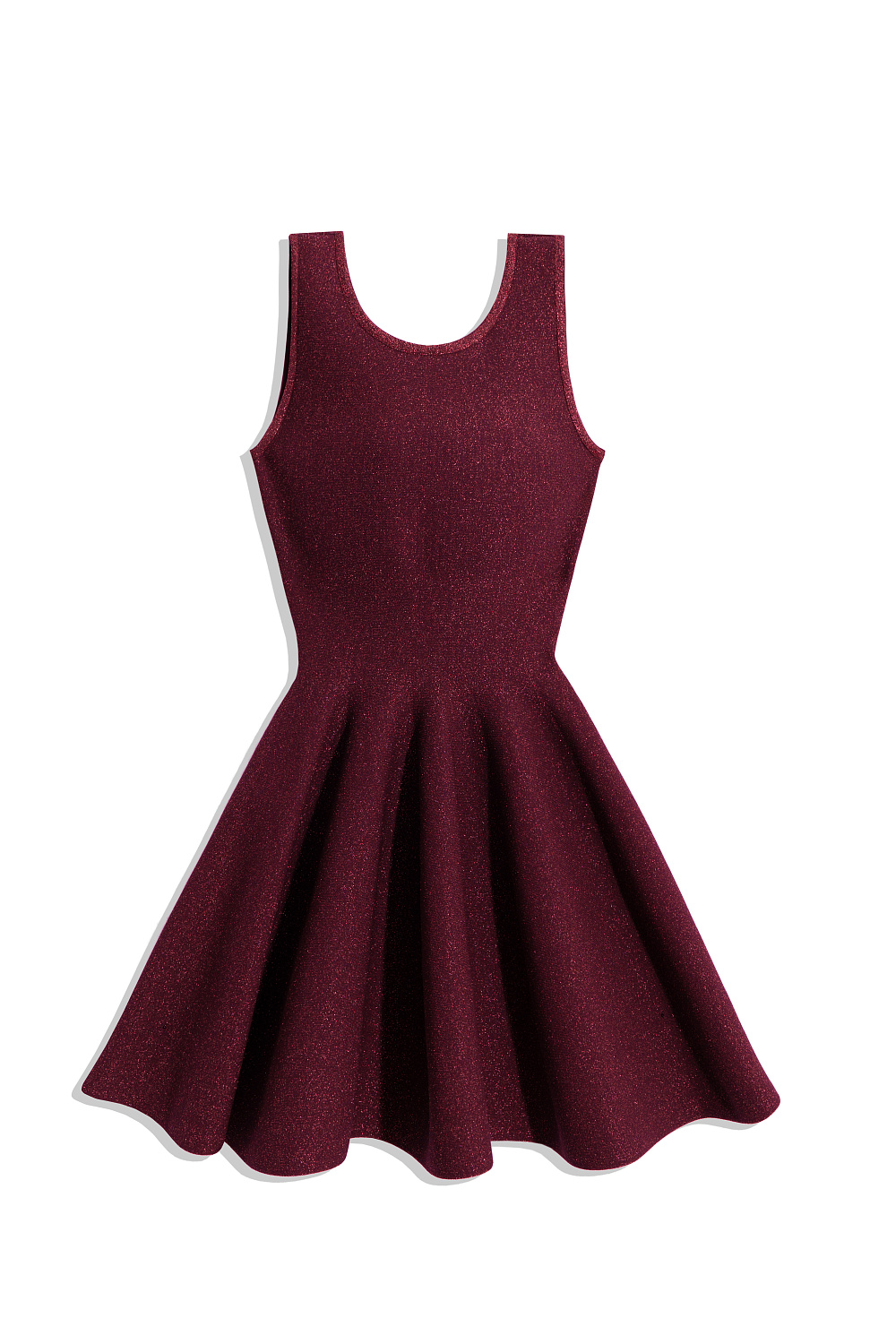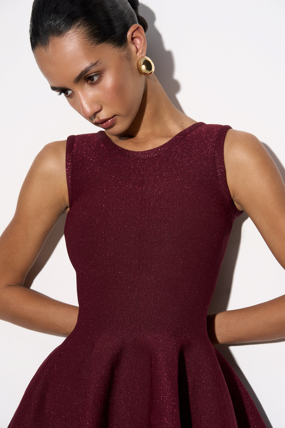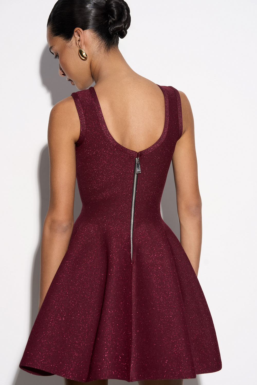 Mini-length knitted dress with lurex. A fitted model with a skirt flared from the waist, sleeveless, with wide straps.