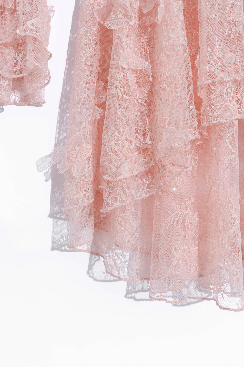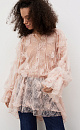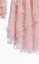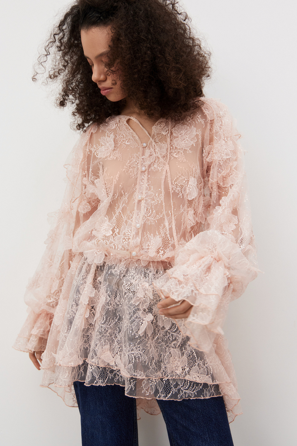 Mini-length dress made of thin lace with voluminous flower decoration. Loose fit model with long sleeves, cuffs and a round neckline with frill. Button closure. The neckline is secured at the neck with a thin cord. The product is made without lining.