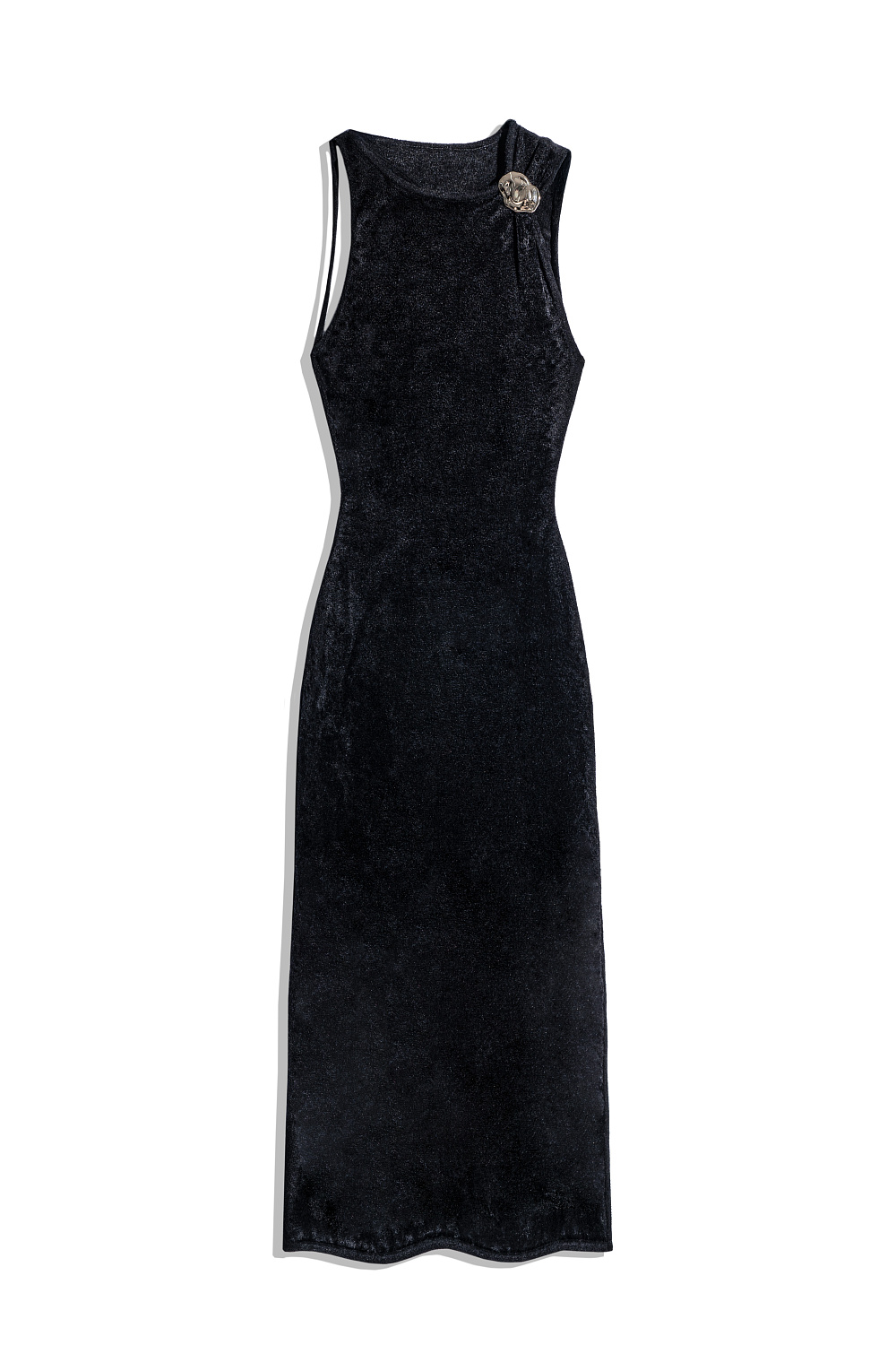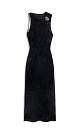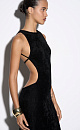 Maxi length evening dress made of viscose. The model has a fitted silhouette with an open back, the drapery on the shoulder is decorated with a metal jumper.