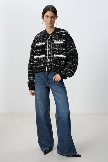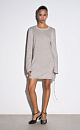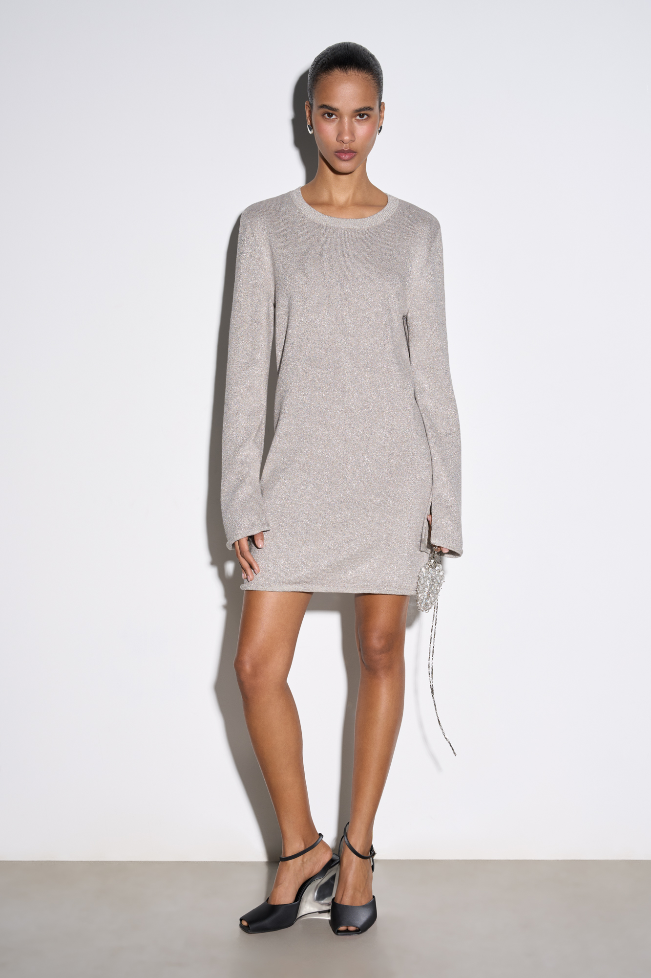 Knitted mini-length dress made of viscose with the addition of lurex. Loose silhouette model with a round neck and long sleeves. The edges of the product are decorated with a roller.