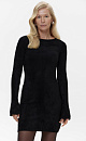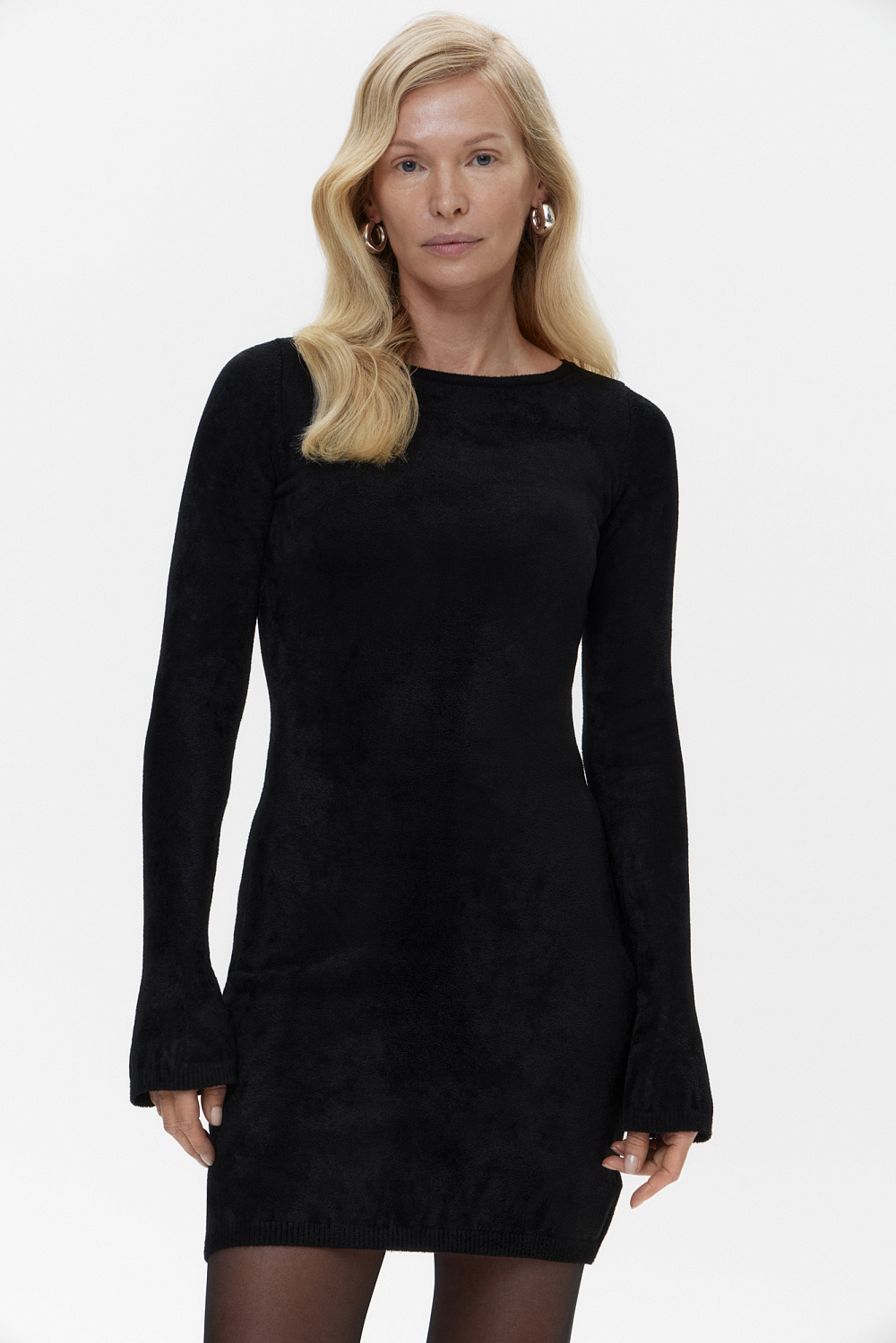 Knitted mini-length dress made of velvet viscose. The model has a fitted silhouette with a round neckline and long sleeves, slightly flared at the cuffs. The edges of the product are ribbed.