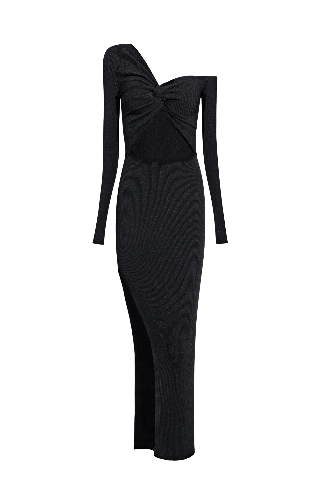 Knitted maxi dress made of viscose. The model has a fitted silhouette with long sleeves, an open shoulder and a twist at the chest.