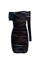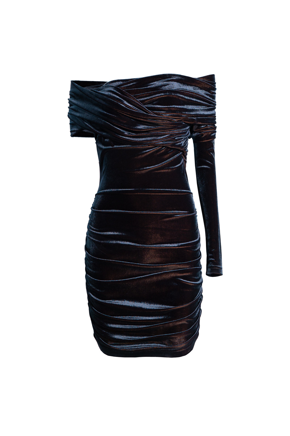 Mini length velor dress. The model has a fitted silhouette with open shoulders and one sleeve. The product is decorated with drapery. Thanks to the unusual texture of the fabric, a color shimmering effect is achieved.